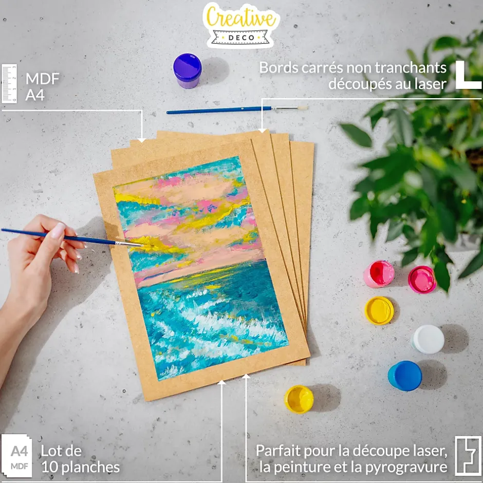 EXCELLENTE QUALITÉ – Chaque planche a une taille de 30 x 21 cm – approximativement le format d’une feuille de papier A4. La longueur et la largeur du panneau ont une tolérance de +/-2 mm. Parfait pour la découpe laser, la gravure, la gravure laser, la peinture, la linogravure, et la pyrogravure enfant.CERTIFIÉ PREMIUM – Matériau léger d’une épaisseur de 2 mm – l’odeur du bois provenant de l’emballage vous donne l’impression d’utiliser du bois naturel et certifié.DÉCOUPE DE PRÉCISION – Les bords carrés non tranchants permettent une utilisation en toute sécurité pour tous les âges ! Tous nos panneaux sont fabriqués dans l’UE selon les normes les plus strictes. Les feuilles de MDF sont parfaites pour les travaux de débutants ainsi que pour une utilisation professionnelle. Elles sont également idéales pour la sublimation.PRODUCTION SOUS LA SUPERVISION DE PROFESSIONNELS – Chaque planche MDF découpée individuellement au laser est fabriquée en présence d’un professionnel qui garantit qu’elles sont exemptes de défauts et nous vous assurons que seules les planches de la plus haute qualité sont livrées à vous, notre client !FABRIQUÉ DANS L’UE – Nous nous procurons nos produits dans l’Union européenne, qui applique certaines des normes les plus élevées au monde. C’est pourquoi, nous pouvons garantir une haute qualité de nos produits à nos clients. Nos produits sont fabriqués à partir de matériaux naturels et non toxiques.