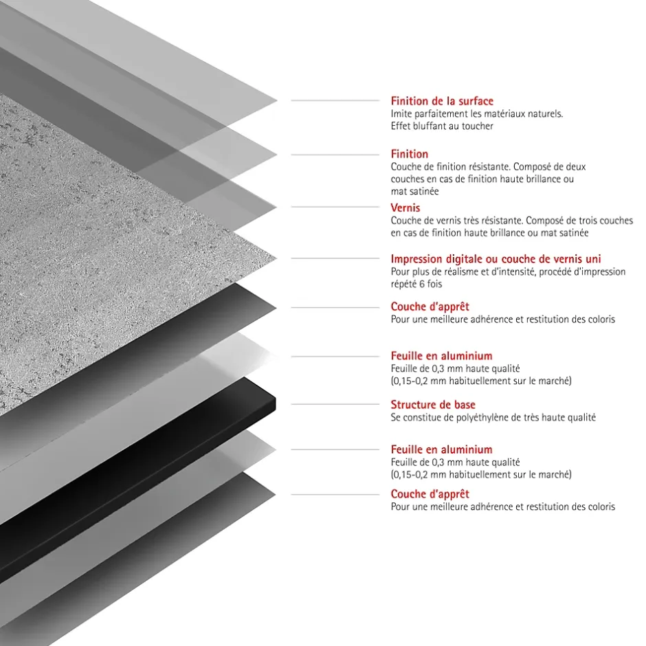 - RÉSISTANT : revêtement en aluminium composite 9 couches. Plaque résistante aux UV, chocs, rayures et à une chaleur allant jusqu’à 100° C. Ne décolore pas. Garantie 10 ans.