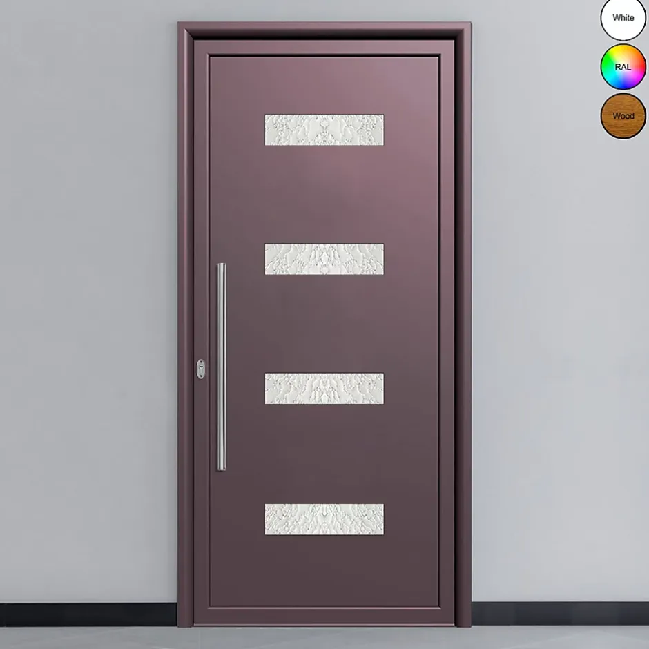 Porte d’entrée aluminium – Modèle 8052 | RAL 4007 | Vitrage Delta MatLa porte d’entrée aluminium 8052 affiche un style sophistiqué avec sa teinte RAL 4007 (prune profond), idéale pour donner une signature contemporaine à la façade tout en restant élégante. Son vitrage Delta Mat diffuse la lumière et préserve l’intimité, tandis que la barre latérale argentée renforce l’ergonomie et la ligne moderne.Disponible en profilé aluminium 55 mm ou 70 mm, elle intègre une rupture de pont thermique de 39 mm (insert polyamide) pour limiter les transferts de chaleur, réduire les déperditions énergétiques et diminuer les risques de condensation. Le double vitrage 4 saisons (24 mm) complète l’ensemble avec une isolation thermique et phonique renforcée, en filtrant une partie des UV et en limitant la surchauffe estivale. Adaptée au neuf comme à la rénovation, elle est compatible avec une fermeture multipoints (option) et existe en dimensions standard ou sur-mesure.Points forts•RAL 4007 : profond, élégant, distinctif•Delta Mat : lumière diffusée + discrétion•Isolation performante (pont thermique 39 mm + vitrage 4 saisons)•Confort acoustique renforcé•Aluminium durable : humidité, corrosion, intempéries•Options sécurité : multipoints, renforts possibles•Fabrication européenne, standard ou sur-mesureCaractéristiques techniques•Code : 8052 | Matériau : aluminium•Coloris : RAL 4007 (autres RAL sur demande)•Vitrage : Delta Mat 4 saisons, double vitrage 24 mm•Poignée : barre latérale finition argentée•Profilé : 55 mm (standard) ou 70 mm (isolation renforcée)•Technologie : rupture de pont thermique 39 mm (polyamide)•Ouverture : battante | Finition : thermolaquage (nuancier RAL)•Sécurité : compatible multipoints (option)•Usage : neuf / rénovation