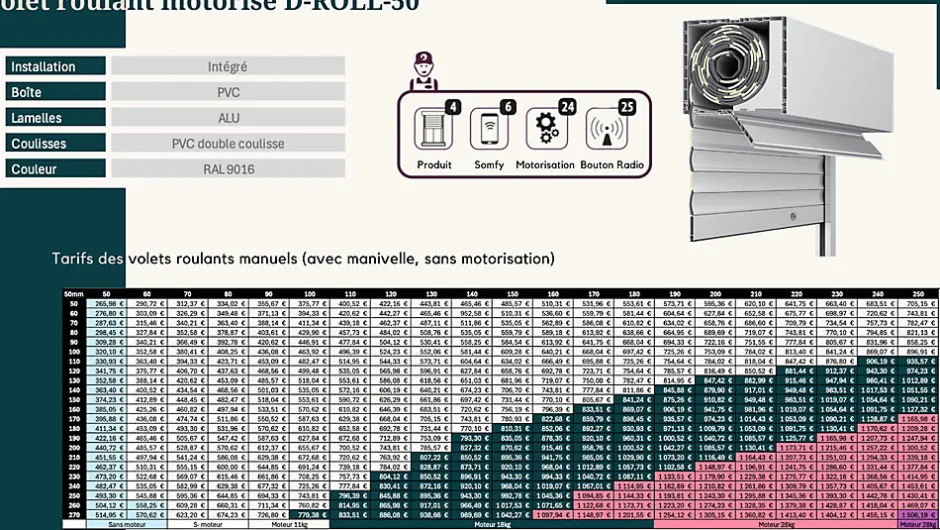 Volet roulant motorisé pour intégration – coffre PVC, lames aluminium (H50) – blanc RAL 9016Conçu avec des matériaux haut de gamme, ce volet roulant motorisé pour intégration associe un coffre et des coulisses en PVC à des lamelles en aluminium H50. Il est parfaitement adapté aux constructions neuves comme aux rénovations, et offre une solution fiable pour améliorer le confort au quotidien tout en protégeant efficacement les ouvertures.La finition blanc RAL 9016, appliquée sur l’aluminium thermolaqué et le PVC, garantit un rendu homogène, une excellente tenue dans le temps et un entretien réduit. La motorisation, disponible en commande radio ou filaire, assure une utilisation fluide et pratique. Les lamelles aluminium H50 renforcent la stabilité de l’ensemble et contribuent au confort thermique et acoustique selon la configuration du bâtiment.Points forts•Intégration soignée et design contemporain, adapté à la majorité des façades.•Coffre et coulisses en PVC : entretien réduit et bonne tenue à l’usage.•Lamelles aluminium H50 : stabilité et robustesse renforcées.•Motorisation au choix : commande radio ou filaire pour un usage simple et régulier.•Garantie constructeur : 10 ans sur la structure aluminium.⸻Dimensions de la boîte (selon largeur L)•L 2100 mm : 200 × 253 mm⸻Caractéristiques techniques•Finition / Couleur : aluminium thermolaqué RAL 9016 (blanc) + PVC RAL 9016 (blanc)•Boîte et coulisses : PVC•Lamelles : aluminium – H50•Motorisation : radio et filaire•Commande : bouton radio ou commande filaire•Garantie : 10 ans sur la structure aluminium•Conformité : conforme aux normes européennes applicables en matière de sécurité et d’isolation