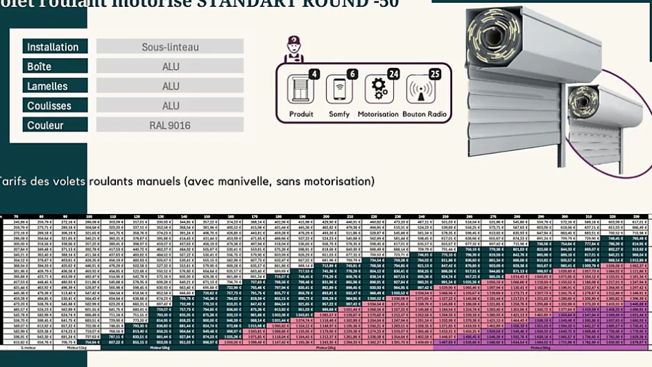 Volet roulant motorisé pour intégration – aluminium thermolaqué RAL 9016 (H50)Conçu en aluminium haut de gamme, ce volet roulant motorisé pour intégration associe robustesse, durabilité et esthétique contemporaine. Il s’adapte aussi bien aux constructions neuves qu’aux rénovations exigeantes, et constitue une solution fiable pour équiper vos ouvertures tout en améliorant le confort au quotidien.La finition thermolaquée RAL 9016 (blanc) garantit un rendu homogène, une excellente tenue dans le temps et un entretien réduit. La motorisation, disponible en commande radio ou filaire, assure une utilisation fluide et pratique. Les lamelles aluminium H50 renforcent la stabilité de l’ensemble et contribuent au confort thermique et acoustique selon la configuration du bâtiment.Points forts•Intégration discrète et design moderne, compatible avec la majorité des façades.•Aluminium thermolaqué : résistance aux intempéries, tenue des couleurs, entretien limité.•Motorisation au choix : commande radio ou filaire pour un usage simple et régulier.•Lamelles aluminium H50 : robustesse et stabilité renforcées.•Garantie constructeur : 20 ans sur la structure aluminium.⸻Dimensions de la boîte (selon largeur L)•L 2700 mm : 205 × 205 mm⸻Caractéristiques techniques•Finition / Couleur : aluminium thermolaqué RAL 9016 (blanc)•Boîte et coulisses : aluminium•Lamelles : aluminium – H50•Motorisation : radio et filaire•Commande : bouton radio ou commande filaire•Garantie : 20 ans sur la structure aluminium•Conformité : conforme aux normes européennes applicables en matière de sécurité et d’isolation