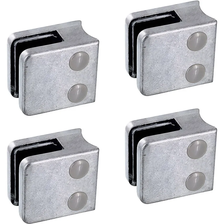 - Chaque boîte contient 4 pinces à verre, 8 cales caoutchouc adaptées à l’épaisseur de verre choisie (livrées dans un sachet séparé), 8 cache-vis couleur gris clair, 4 vis de fixation CHC – M8 x 20 mm – acier zingué