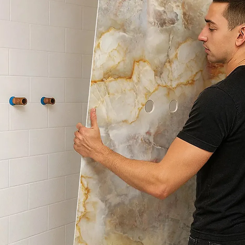 Panneaux muraux de douche en PVC composite de 3 mm et profilés – Faciles à poser et à nettoyer (Fabrication française) Protégez et modernisez votre salle de bain avec ce pack de panneaux muraux, résistants, élégants et prêts à poser. Alternative contemporaine à la faïence murale, ces panneaux en PVC de 3 mm offrent une solution rapide, pratique et durable pour habiller vos murs de douche. Leur finition apporte un rendu premium tout en facilitant l’entretien au quotidien. Points forts : Pack complet : 2 panneaux (90×220 cm et 120×220 cm) + 3 profilés (2 profilés de finition et 1 profilé d’angle). Pose rapide : installation rapide pour un résultat propre et durable. Découpe facile : une découpe à la scie cloche est conseillée pour l’installation de la robinetterie. Raccordables : panneaux raccordables à droite ou à gauche selon la configuration de votre douche. Supports compatibles : Placo, carrelage existant, faience, toile de verre, bois, béton. Conception française : Dessiné dans notre studio graphique et fabriqué dans notre atelier à Agen (47 – France) Caractéristiques : Couleur des panneaux : Gris, beige, blanc, teintes doréesCouleur des profilés : blanc Dimensions des panneaux : 90×220 cm et 120×220 cm Matériau : PVC Épaisseur : 3 mm Entretien : compatible raclette silicone, micro-fibre, éponge douce et eau chaude (pas de produits abrasif) -> si besoin ajouter du vinaigre blanc. Étanchéité : Joints silicone : appliquez un joint silicone entre les panneaux, le receveur et les profilés. Une solution élégante, durable et simple à installer pour transformer votre espace douche.