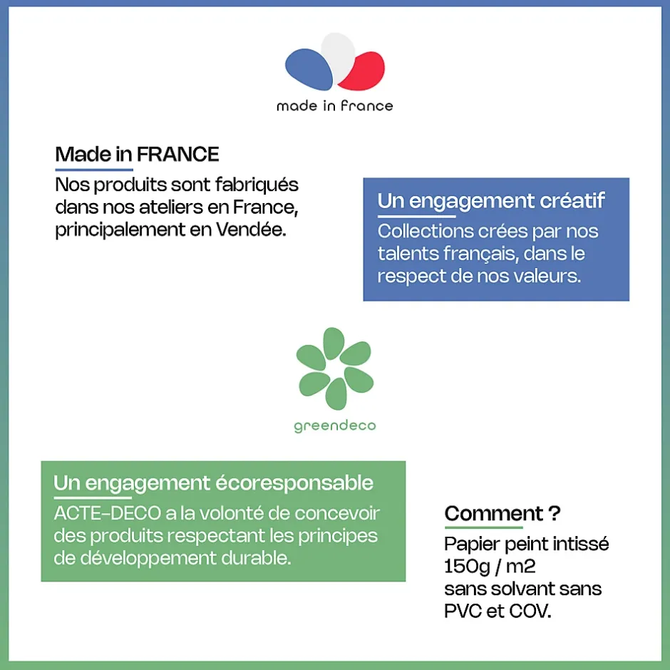 Papier peint intissé sans PVC 150g certifié OEKO-TEX. Encres latex sans solvant et sans COV. Fabrication Française : Notre atelier fabrique, à réception de votre commande, les lés qui composeront votre décor panoramique. Chaque commande est créée localement, en Pays de la Loire, avec le plus grand soin. PROPRIETES Aspect mat lisse (calandré). Très bon rendu des couleurs. Très bonne stabilité dimensionnelle. Masque les petites imperfections du mur, la préparation du mur est simplifiée. Bonne résistance à la déchirure lors de la pose. Pose facile. Se nettoie avec un léger coup d’éponge à l’eau savonneuse. APPLICATIONS Pose simple avec encollage du mur Matériel : colle spéciale intissé, brosse à maroufler, cutter, règle et éponge – Pas besoin de table à tapisser Assurez-vous que le mur est bien propre, sec, lisse et sans poussière Tracer une ligne verticale et poser le premier lé en le mettant bien d’aplomb Encoller le mur entièrement et poser votre premier lé sans l’encoller Maroufler à partir du milieu en chassant les bulles d’air Poser les lés suivant en les raccordant bord à bord Couper les surplus du haut et du bas Nettoyer les surplus de colle avec une éponge humide
