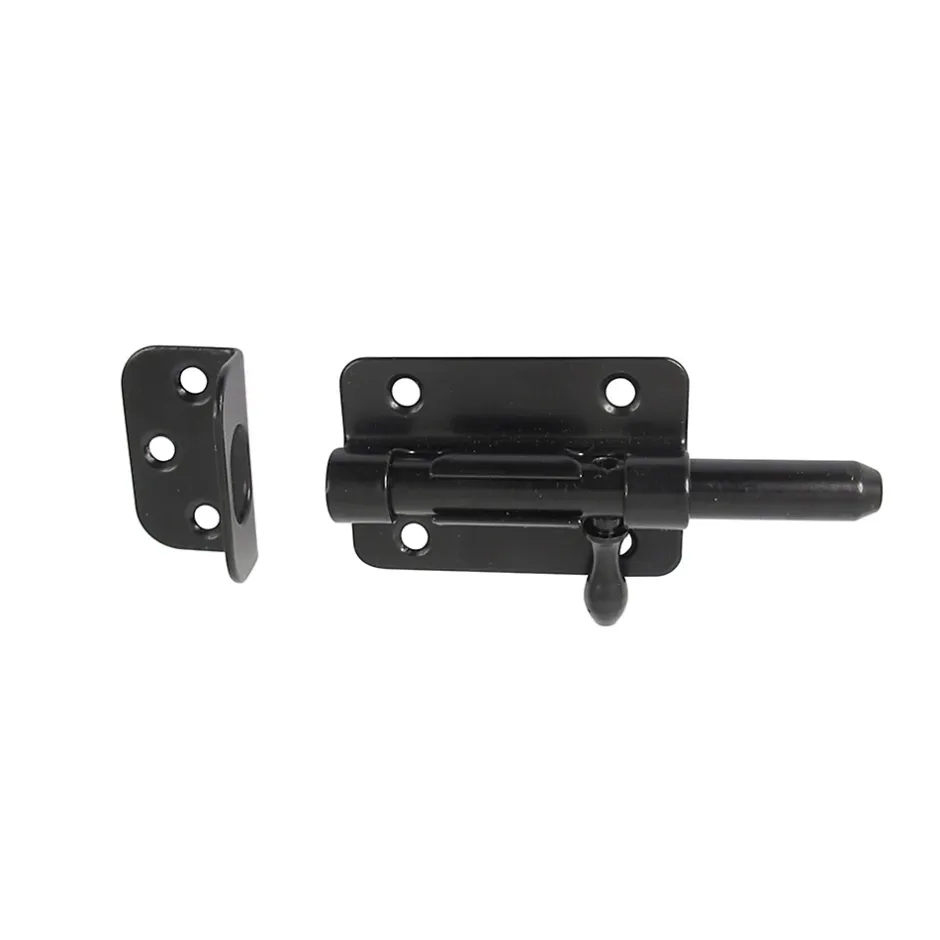 Verrou en acier disponible du diamètre 12 mm en finition laquée noir. Verrou monté avec une poignée de forme ergonomique pour une meilleure préhension. Cette poignée est montée traversante sur le pêne et emmanchée sous presse pour une meilleure résistance. Gâche en forme de L avec trou oblong pour faciliter le réglage et la pose.