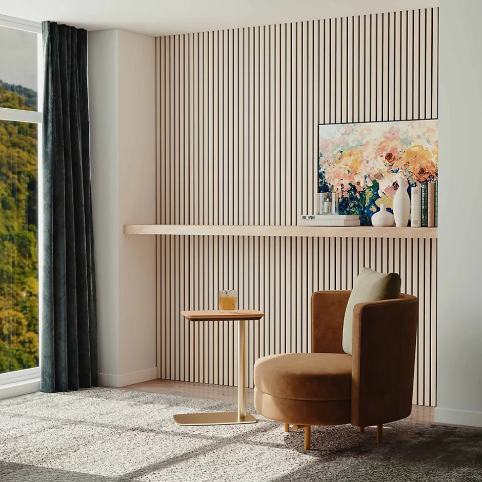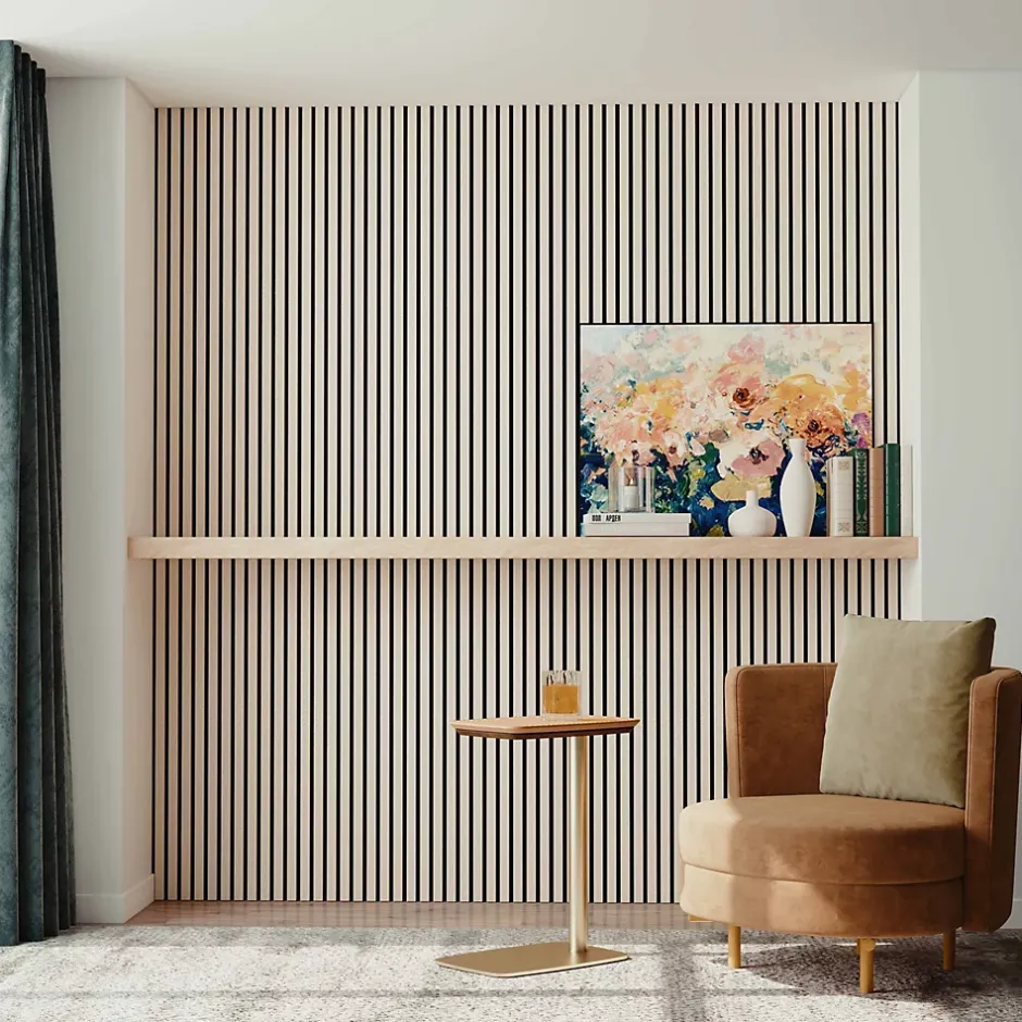 Apportez confort acoustique et style à votre intérieur grâce à ce panneau acoustique mural décoratif. il combine esthétique et performance phonique.Panneau mural acoustique décoratif en MDF , absorption sonore jusqu’à 0,7. Facile à poser, joint invisible et design moderne effet bois. Confort acoustique amélioré : réduit l’écho et crée une ambiance plus intime et agréable, idéal pour le télétravail, le home cinéma ou les studios. Effet bois naturel : apporte chaleur et élégance, remplaçant avantageusement un simple mur peint ou tapissé. Entretien facile : surface simple à nettoyer avec un chiffon sec ou légèrement humide. Qualité sonore exceptionnelle : l’association de feutre acoustique haute densité et de lamelles de bois assure une absorption optimale du son. Installation facile et flexible : pose possible avec colle ou vis pour une mise en place rapide. Polyvalent : adapté aux espaces privés (salon, chambre, bureau) comme aux lieux publics (restaurants, hôtels, salles de réunion). Investissement durable : conserve son apparence et sa performance acoustique dans le temps.
