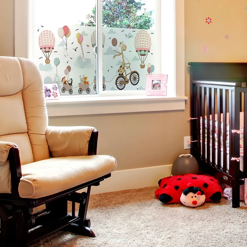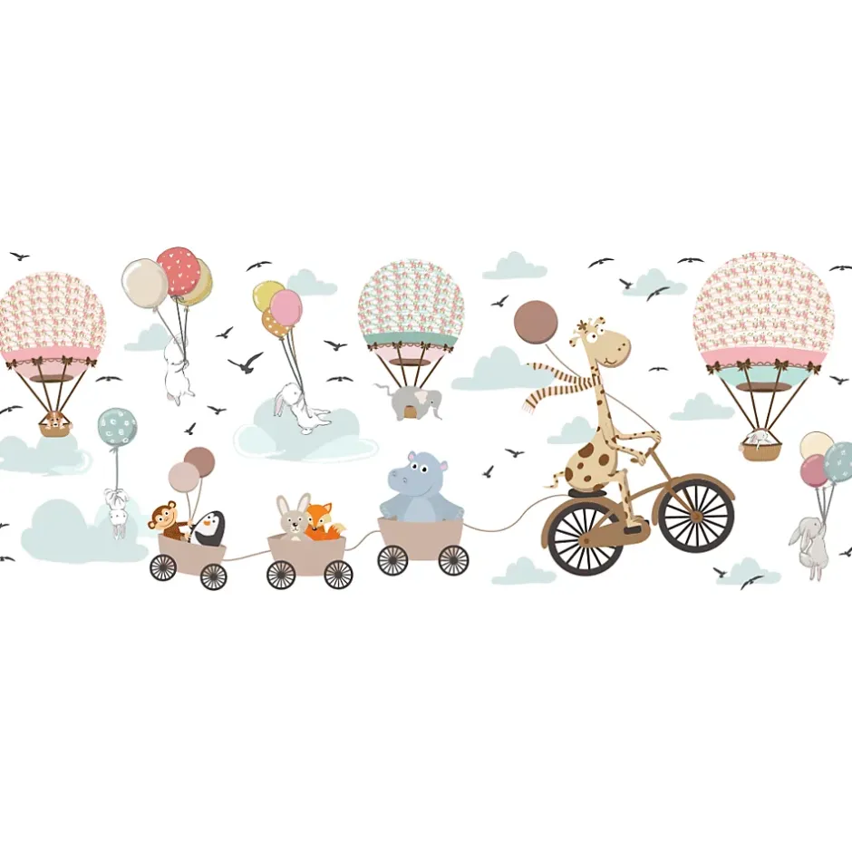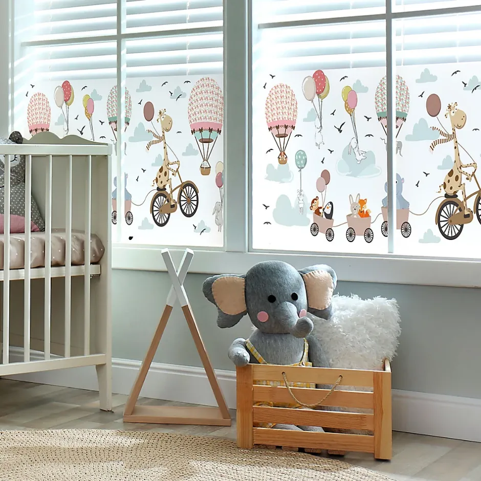 Sticker occultant pour vos fenêtres et votre salle de bain Ce sticker représente les animaux et montgolfières dans les nuages Les animaux sont : la girafe sur son vélo, l’hippopotame, le renard, le lapin, le pingouin et le singe dans les wagons, un lapin dans la montgolfière, un éléphant dans la montgolfière, un chien dans la montgolfière, quatre lapins en ballons, les oiseaux et les nuagesCe sticker occultant et privatif pour fenêtre mesure H40 x L100 cmVitrophanie – Sticker dépoli translucide privatif pour vitres et fenêtres Bubble free – Pose facile sans bulle d’air Ce sticker occultant dépoli laisse passer une lumière douce et diffuse pour plus de confort dans votre intérieur Il limite la visibilité à travers les vitres et permet ainsi d’obtenir sécurité et intimité, tout en décorant votre maison Il empêche aussi les vis-à-vis de jour comme de nuitUne fois appliqué sur une fenêtre, ce sticker : – absorbera 15 % de la lumière visible – transmettra 85 % de la lumière visible Conseil pour la pose: 1/ Découper la longueur nécessaire (prendre un peu plus large) 2/ Humidifier fortement la vitre 3/ Décoller le sticker du papier support et le positionner sur la vitre humide 4/ Racler du centre vers l’extérieur pour retirer l’eau et les bulles d’air 5/ L’humidité permet de le déplacer pour une position parfaite 6/ Laisser sécher 7/ Couper au cutter les bandes qui dépassent de la vitre Durée de vie: 5-8 ans Où coller cet autocollant déco occultant ? Les idées Déco Ambiance Sticker: Ce sticker occultant trouvera facilement sa place sur les baies vitrées, les fenêtres de salle de bain, cuisine, toilette, chambre, et autres fenêtres de la maison, les rambardes vitrées extérieures et intérieures, et même sur les portes de douche Ce sticker occultant peut être aussi utiliser en milieu professionnel: pour les vitres de bureaux, salle d’attente, vitrines de magasin, ou toute autre vitre extérieureL’adhésif occultant fenêtre vous pe