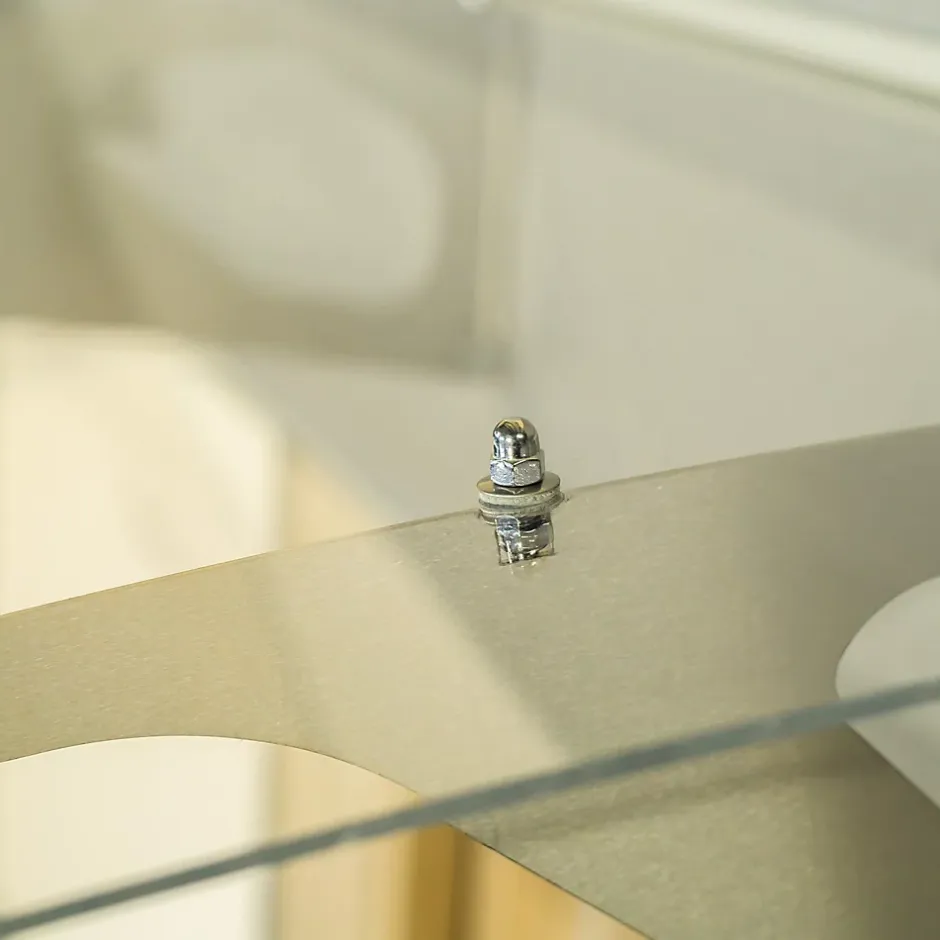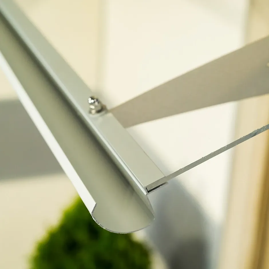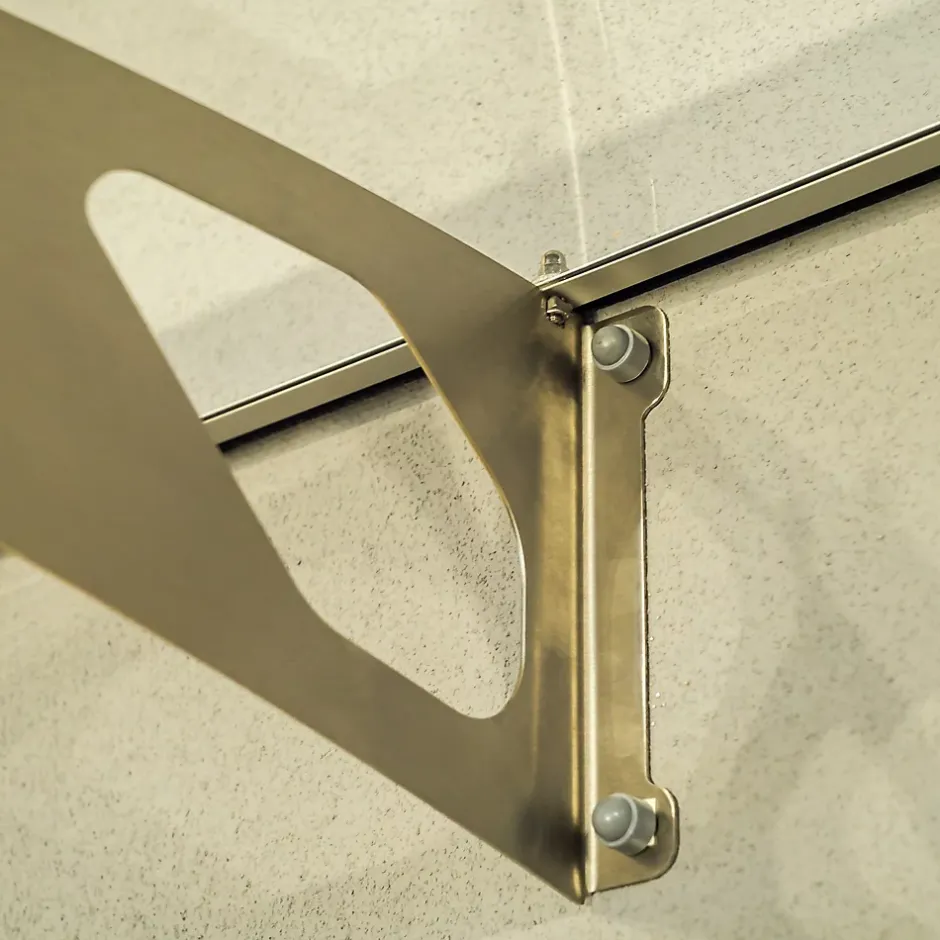 Auvent élégant et robuste, supporté par trois consoles en acier inoxydable, couvert par une plaque de PMMA, avec un joint d’étanchéité protégeant la façade côté mur et une gouttière en partie frontale.