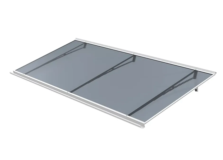 Auvent plat, structure aluminium thermolaquée supportée par trois consoles porteuses. Revêtement en plaque de polycarbonate alvéolaire avec filtre UV. Évacuation des eaux pluviales assurée par une gouttière frontale.