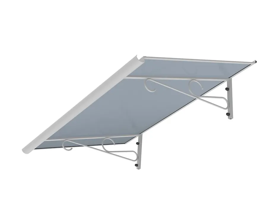 Auvent plate, soutenue par deux consoles de style rétro, avec gouttière d’évacuation des eaux en façade, joint d’étanchéité côté mur, couverture en plaque de polycarbonate alvéolaire avec filtre UV, aluminium thermolaqué.
