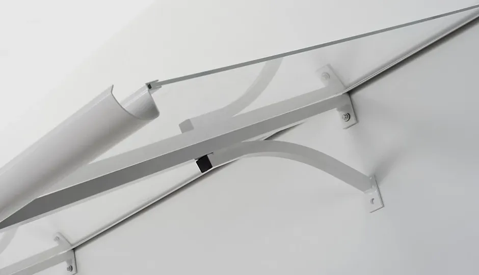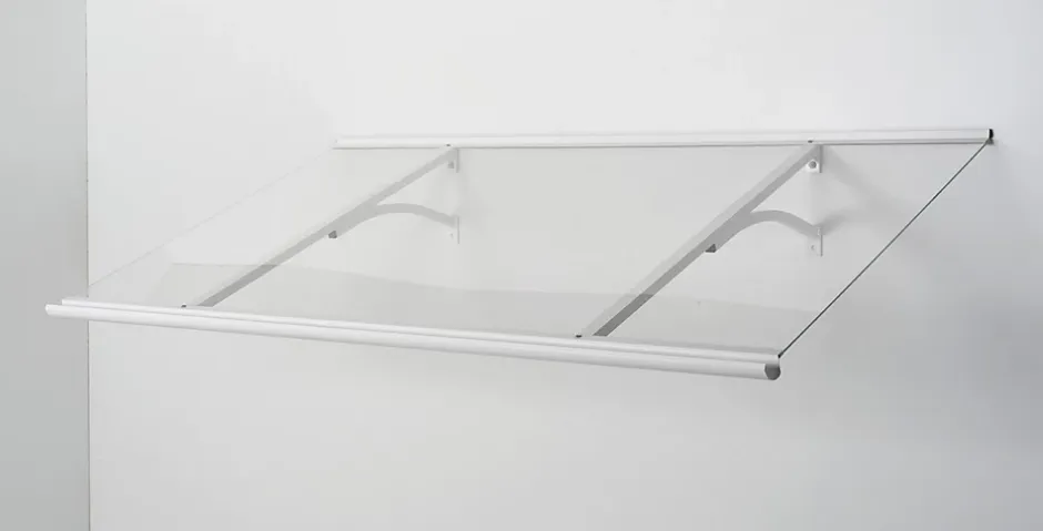 Auvent plat sur deux poteaux, structure thermolaquée, couverture en plaque de PMMA transparente, équipé d’une gouttière d’évacuation et d’un joint d’étanchéité.