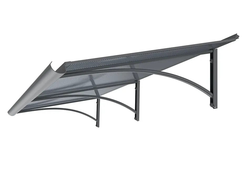 Auvent plat, équipé d’une gouttière frontale assurant l’évacuation contrôlée des eaux pluviales. Structure en aluminium thermolaqué, offrant une haute résistance à la corrosion. Panneau en polycarbonate alvéolaire avec traitement anti-UV garantissant une protection durable contre le rayonnement solaire. Structure supported by three supports.