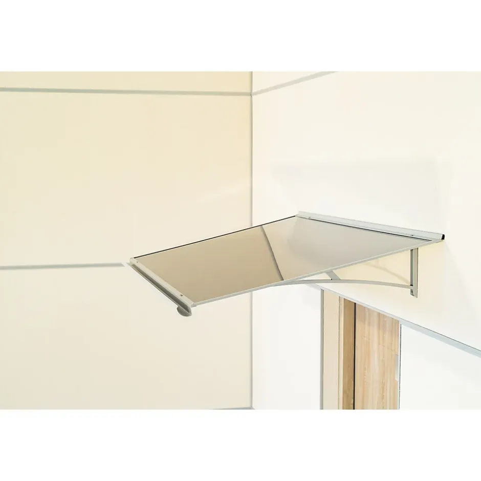 Auvent plate, soutenue par deux consoles, structure en aluminium thermolaqué, joint d’étanchéité côté mur, couverture en panneau composite Al/PE/Al, anthracite sur la face supérieure et blanc sur la face intérieure. Auvent extrêmement résistant au style industriel.