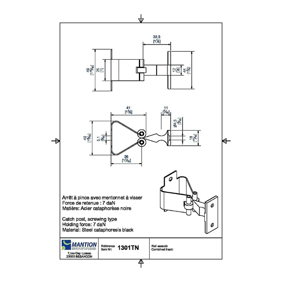 L’arrêt Renault à pince de Mantion est conçu pour permettre une pose facile et sans complications. Le système de pince, sans nécessité de soudure ou de perçage approfondi, rend ce produit accessible même aux utilisateurs les moins expérimentés. Cette facilité d’installation se traduit par un gain de temps significatif sur le chantier ou à domicile.Fabriqué avec des matériaux de haute qualité, cet arrêt à pince bénéficie d’une construction solide. Il résiste efficacement aux intempéries et à la corrosion, ce qui en fait un choix fiable pour tout type de portail, qu’il soit en bois, métal ou PVC. La longévité est au cœur de la conception de ce produit Mantion, assurant ainsi une tranquillité d’esprit prolongée pour l’utilisateur.Le design de l’arrêt Renault à pince Mantion inclut un mentonnet à visser qui permet un ajustement précis et sécurisé. Cette caractéristique garantit que le produit peut être adapté à divers types et tailles de portails, offrant une versatilité appréciable pour les utilisateurs. Cette adaptabilité facilite également la réutilisation de l’arrêt sur différentes installations au fil des besoins évolutifs. Caractéristique technique :Matière : Acier cataphorèse noire