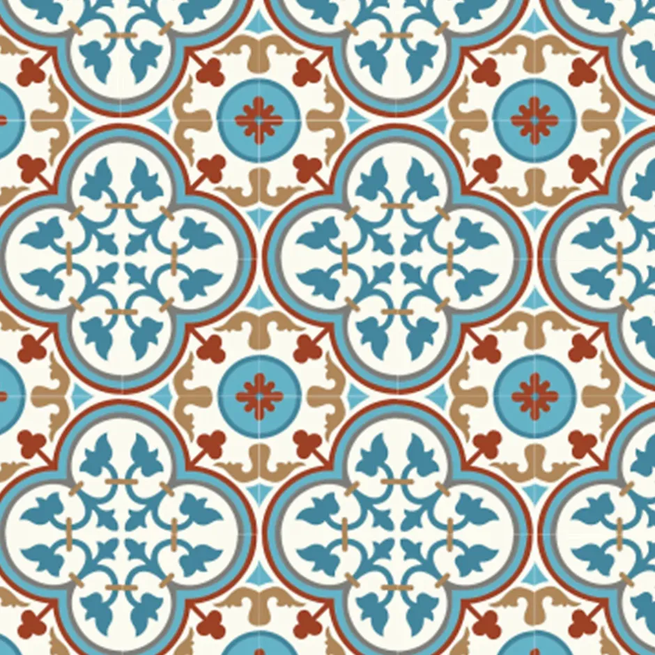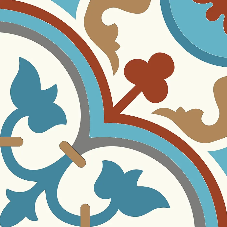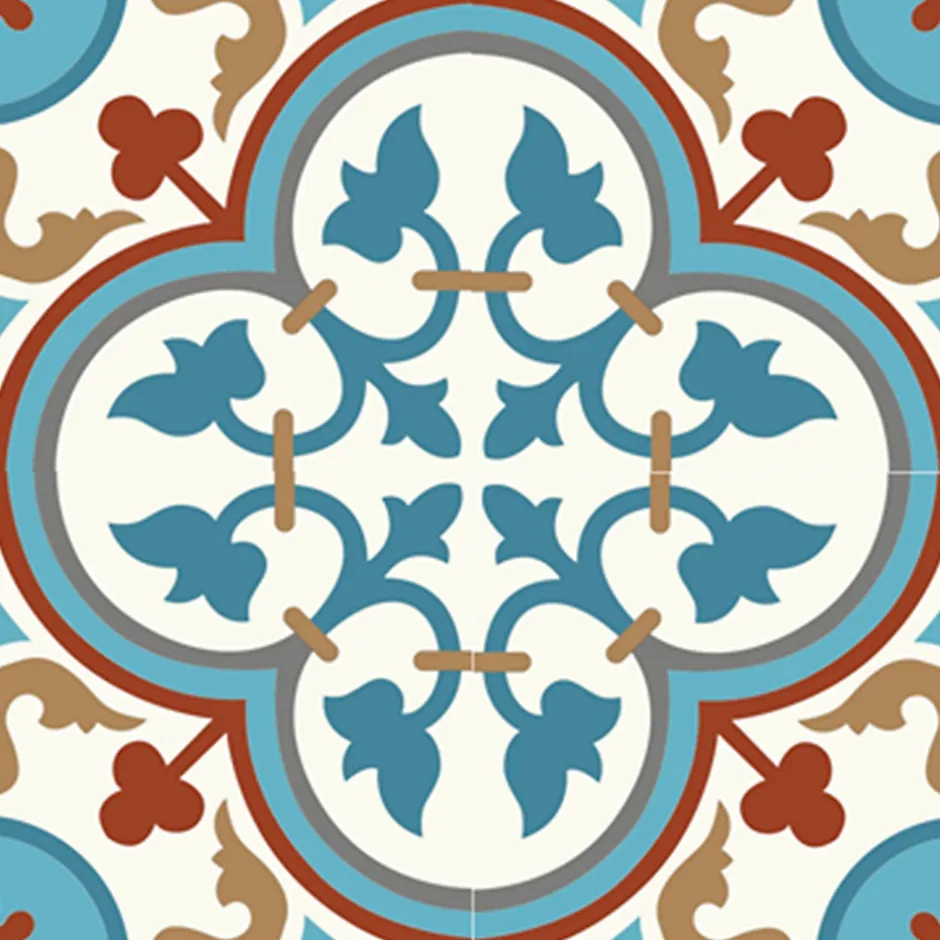 Carreaux de ciment de fabrication artisanale ; chaque carreau est fabriqué individuellement.Dim: 20 x 20 cm épais. 16 mm ; décor dans la masse épais. 5 mm.Couleurs : Blanc 48 / Bleu 54 / Bleu 58 / Gris 42 / Ocre 102 / Rouge 83.Carreaux destinés pour revêtements de sols intérieurs : Cuisines, salles de bains, entrées, couloirs, salons, chambres etc…Les carreaux de ciment sont naturellement poreux, il est conseillé de les imperméabiliser afin de les préserver de toutes taches et salissures.Conditionnement : carton de 14 pièces soit 0,56 m².Ce carreau au motif bagatelle BAG1, de style classique, rétro, oriental chic, Maison de Maître crée un point focal spectaculaire et donne du caractère à n’importe quelle pièce.Offrez à vos sols et murs une âme historique et un charme inimitable grâce à ce carreau de ciment au motif quadrilobe fleuri. Parfait pour une rénovation ou pour apporter une touche d’authenticité à une construction moderne.Un dessin hypnotique et harmonieux basé sur le motif ornemental du quadrilobe, inspiré des styles art gothique et mauresque. Le raccord dessine de délicates fleurs stylisées et des rosaces centrales.Une palette de couleurs chic ; La couleur dominante bleu canard, turquoise foncé pour une ambiance fraîche et apaisante. L’ocre apporte une chaleur subtile et un contraste raffiné. De petites touches rouge brique dynamise l’ensemble et souligne les détails floraux et le fond blanc met en valeur la richesse des couleurs.