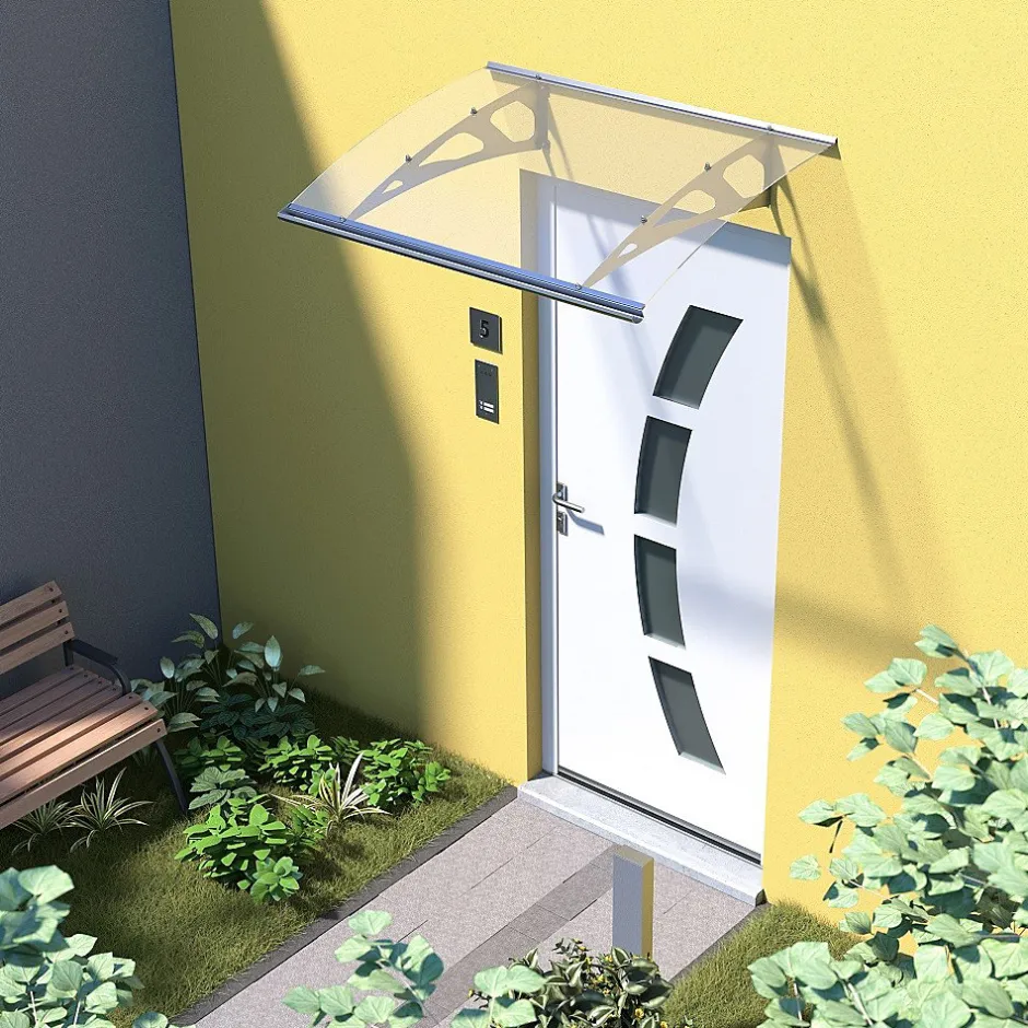 Auvent élégant et robuste, supporté par deux consoles en acier inoxydable, couvert par une plaque de PMMA, avec un joint d’étanchéité protégeant la façade côté mur et une gouttière en partie frontale.