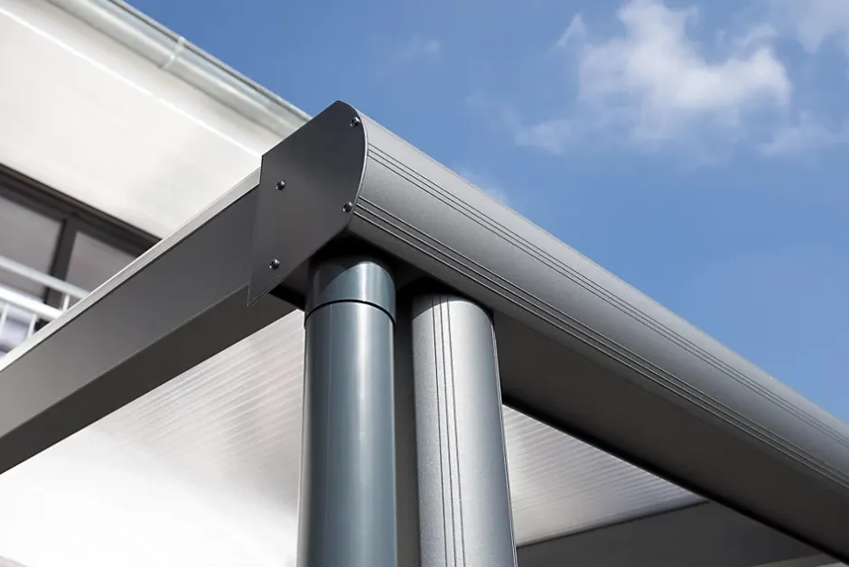 Auvent SKAN HOLZ « Greifswald »• Dimensions extérieures : 216 x 135 cm• Structure d’excellente qualité en aluminium, à revêtement structuré poudré anthracite (DB703)• Poteaux 11 x 11 cm, arrondi à l’avant, comprenant des platines de fixation• Design moderne aux lignes profilées marquantes• Gouttière intégrée à la panne• L’écoulement se fait par un tuyau de descente fourni• Système intégré pour fixation murale• Couverture de toit en plaques alvéolaires de polycarbonate d’une épaisseur de 10 mm, clair• Livraison sans matériel de fixation muraleStructureLe kit de construction haut de gamme, en aluminium revêtu par poudrage, est équipé de poteaux de 11 x 11 cm, arrondis à l’avant. La structure stable et robuste adopte un design moderne avec des lignes de profilés nettes.Une gouttière est déjà intégrée à la panne. L’évacuation de l’eau peut se faire, au choix, dans le poteau ou le long du poteau. Le raccord mural est déjà intégré dans le profilé de la paroi.Couverture de toitLa couverture de toit se compose de panneaux alvéolaires en polycarbonate stables de 16 mm d’épaisseur. Leur face supérieure réfléchit les rayons UV. Ils sont fixés au moyen de profilés d’aluminium de haute qualité dotés de joints à lèvre en EPDM.AncrageLe kit comprend des platines de fixation en acier plat galvanisé et des chevilles pour la fixation sur les fondations à réaliser par le client. Ce système garantit un assemblage parfait sur le support.