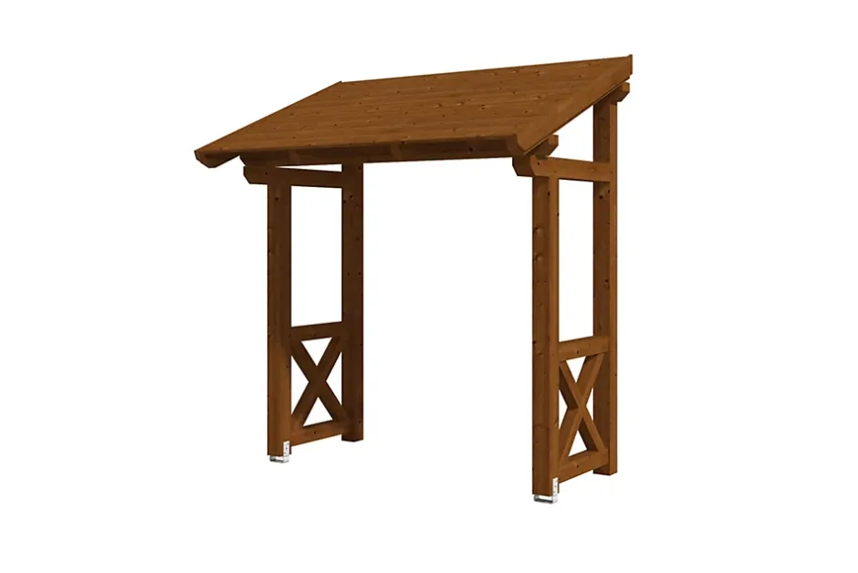 Auvent de porte d’entrée SKAN HOLZ « Paderborn 4 »• Dimensions extérieures : 242 x 156 cm• Structure massive en bois massif abouté d’excellente qualité (BMA épicéa)• Peinture couleur noyer• Montants 12 x 12 cm• Pannes 12 x 12 cm• Chevrons 6 x 12 cm• Véritables assemblages à tenons et mortaises• Chevrons entaillés• Support à visser compris• voligeage de 20 mm• Bardeaux disponibles en accessoires• Livraison sans matériel de fixation muraleStructureLa structure est réalisée en bois massif de construction (KVH). On entend par KVH du bois d’épicéa massif collé sans fin et séché mécaniquement. Chaque section de bois est séchée, scannée pour identifier les défauts, triée et collée de manière résistante aux intempéries par dents collées. Ses fissures, ses branches et de petits nœuds reflètent le caractère des matériaux utilisés.