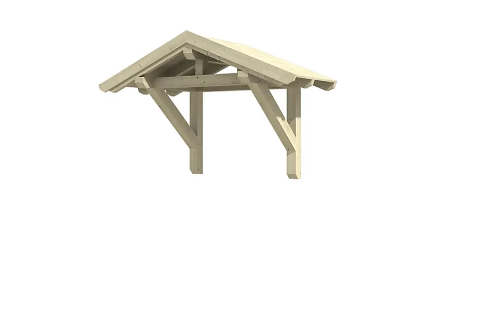 Auvent de porte d’entrée SKAN HOLZ « Siegen 1 »• Dimensions extérieures : 247 x 115,5 cm• Structure massive en bois massif abouté d’excellente qualité (BMA épicéa)• Sans peinture couleur• Montants 12 x 12 cm• Pannes 12 x 12 cm• Chevrons 6 x 12 cm• Véritables assemblages à tenons et mortaises• Chevrons entaillés• voligeage de 20 mm• Bardeaux disponibles en accessoires• Livraison sans matériel de fixation muraleStructureLa structure est réalisée en bois massif de construction (KVH). On entend par KVH du bois d’épicéa massif collé sans fin et séché mécaniquement. Chaque section de bois est séchée, scannée pour identifier les défauts, triée et collée de manière résistante aux intempéries par dents collées. Ses fissures, ses branches et de petits nœuds reflètent le caractère des matériaux utilisés.Traitement coloréCe kit ne bénéficie d’aucun traitement coloré. Les bois destinés à une utilisation en extérieur sont constamment soumis aux conditions météorologiques, ainsi qu’aux risques d’infestations de champignons ou d’insectes. Il faut donc régulièrement y appliquer une couche protectrice, la toute première avant le montage. Utilisez avant tout un primaire de protection du bois contre les infestations de champignons et d’insectes. Appliquez ensuite une couche intermédiaire et finale de lasure ou de peinture de qualité pour préserver le bois de la coloration et des dégâts dûs aux rayons UV. Prévoyez des intervalles d’environ 4 à 5 ans entre les applications, mais au plus tard avant l’apparition de dégâts visibles. Veuillez suivre les instructions de traitement du fabricant de la lasure.Couverture de toitLe toit est livré avec des planches de toit de 20 mm d’épaisseur à couvrir ensuite des bardeaux (à commander en option).