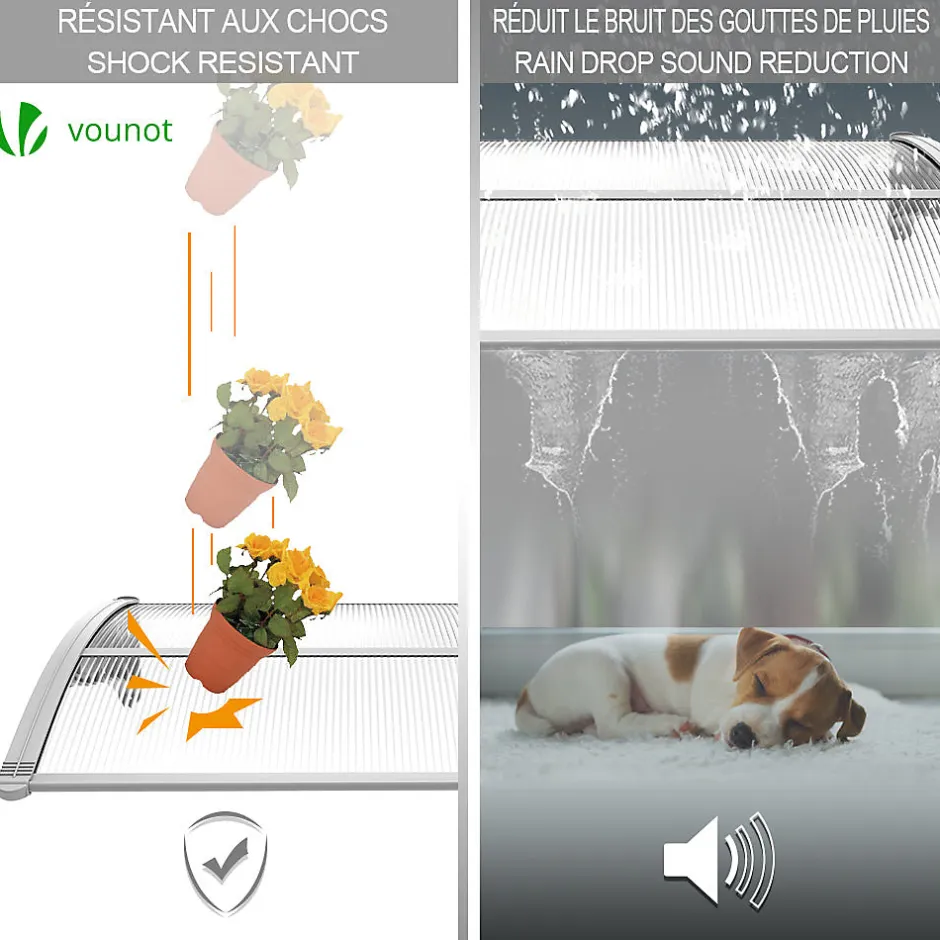 LES + PRODUITSFacile d’installationBonne protection pour les devants de porteConnexion possible de plusieurs auventsRésistant à la corrosionDESCRIPTIONFacile à installer et convient pour plusieurs endroits. Pratique pour aménager votre extérieur devant une porte d’entrée mais pas seulement.Auvent de porte en Polycarbonate, léger et stable. La plaque en polycarbonate (épaisseur de 6 mm) est résistante à la corrosion et aux chocs. Le cadre voûté en PPO est renforcé par des bandes aluminiums.Cadre voûté arrondi en plastique rigide robuste. Résistance face à la corrosion, au vent, la pluie, à la pluie et aux rayons UV, etc. Moins bruyant par temps de pluie ou de grêle.Le cadre voûté en PPO qui est résistant au feu, aux UV, à la pluie, à la neige, et aux chocs. Sa résistance aux intempéries est de l’ordre de -40 ℃ à 120 ℃.La conception ondulée du cadre de support multipoint fournit trois points de support de style européen.Le cadre est renforcé par des bandes d’extrémités en aluminium. La stabilité de l’aluminium, la résistance à l’oxydation et la bonne ductilité de l’aluminium permettent à la voile de résister aux vents violents et aux fortes pluies.CARACTÉRISTIQUESEpaisseur de plaque : 6mmTailles Disponibles : 200CM*80CM ; 120CM*80CM ; 100CM*80CMMatériaux : Polycarbonate, AluminiumA fixer au murConforme aux normes de sécurité en vigueur dans l’UEIMPORTANT :Les livraisons se font en France métropolitaine à l’exception des îles qui ne sont pas reliées au continent par un pont (Corse, Ile d’Yeux etc.) et des DOM-TOM.