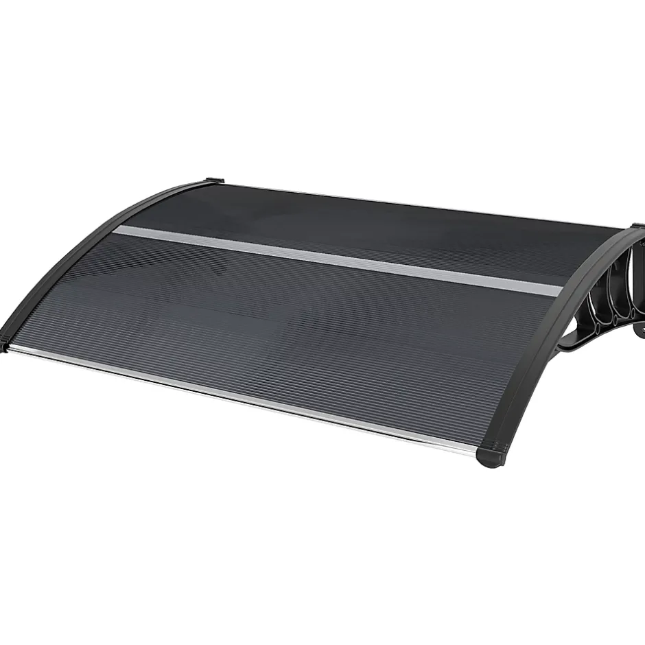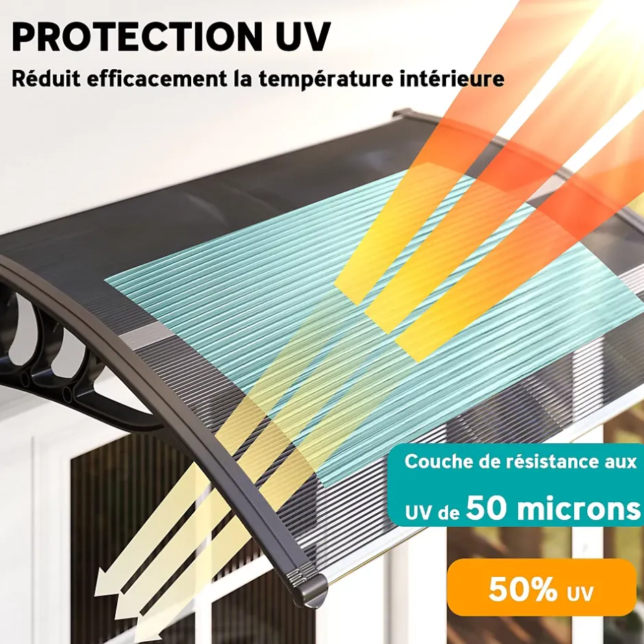 Optez pour notre marquise de porte extérieur double transparente, résistante au soleil, aux UV, à la pluie modérée et à la neige fine. Son design incurvé assure protection et confort. Installation facile sur tout mur, idéal pour portes et fenêtres. Profitez de l’extérieur en toute tranquillité avec cette solution durable.Caractéristiques :- Marquise avec panneaux en polycarbonate dotés d’une protection UV pour bloquer les rayons solaires nocifs- Support robuste en polypropylène pour une plus grande durabilité- Protège contre la neige légère et les pluies de faibles à modérées- Cet auvent de porte d’entrée comprend tous les accessoires nécessaires pour un montage mural- Idéal pour les fenêtres, les portes et les terrasses- Il est recommandé d’installer ce toit pour porte extérieure sur des murs en ciment (des vis supplémentaires pour bois sont nécessaires pour une installation sur un mur en bois)- Montage nécessaire.Spécifications :- Couleurs : transparent, noir- Matériaux : polycarbonate, polypropylène- Dimensions totales : 100L x 75l x 23H cm- Dimensions du support mural : 75L x 23H cm- Conforme à : CE-CPR- Réf. : B70-051V01BK- Note : veuillez vous assurer que votre porte ou fenêtre correspondent aux dimensions de l’auvent, montez-le au moins à 30 cm de plus haut pour éviter de bloquer l’ouverture