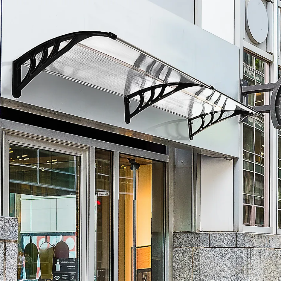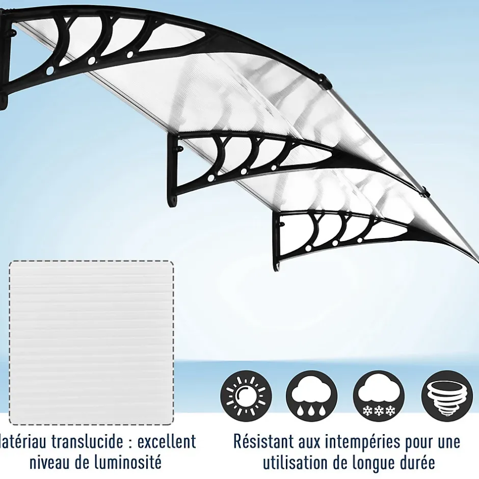 Cet auvent marquise design contemporain voûté arrondi sublimera votre entrée. Vous serez protégé contre la pluie et vous pourrez bénéficier d’une belle luminosité grâce à sa transparence et à sa finesse de conception et fabrication. Caractéristiques : – Installation possible au dessus d’une porte, porte-fenêtre, etc.- Cadre voûté arrondi en plastique rigide robuste ABS : résistance face à la corrosion, au vent, la pluie, les rayons UV, etc.- Elégance et raffinement grâce à la transparence du polycarbonate- Protection assurée contre la pluie et le mauvais temps : pratique pour aménager votre extérieur devant une porte d’entrée mais pas seulement !- Différents usages possibles : entrée d’une maison, d’un commerce, terrasse- Installation simple à l’aide du manuel + kit de fixation mural fourni- Recommandation : siliconer les jointures pour une étanchéité et fixation optimum Spécifications : – 2 coloris au choix : transparent, noir ou brun fumé, noir- Matériaux principaux : polycarbonate, plastique rigide ABS, aluminium- Dimensions totales : 195L x 80l x 23H cm- Dimensions de chaque panneau polycarbonate : 95L x 37l cm- Dimensions du support mural : 80L x 23H cm- Accessoires fournis : 6 vis autotaraudeuse et 6 vis à expansion- Certification norme CE- Livraison effectuée en un colis- Réf. : B70-047WT/BN