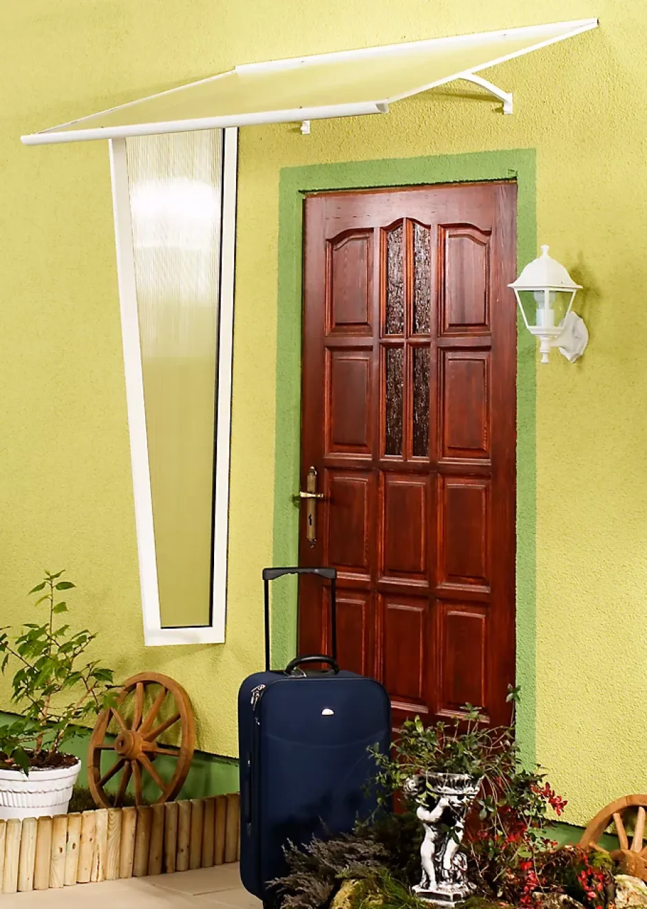 Auvent plat, structure aluminium thermolaquée supportée par trois consoles porteuses. Revêtement en plaque de polycarbonate alvéolaire avec filtre UV. Évacuation des eaux pluviales assurée par une gouttière frontale.