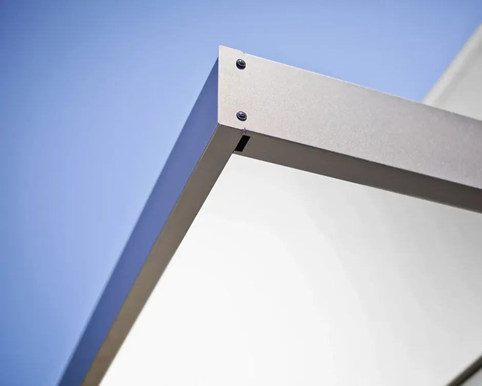 - Profilé robuste en aluminium laqué et supports en acier galvanisé, finition gris foncé.