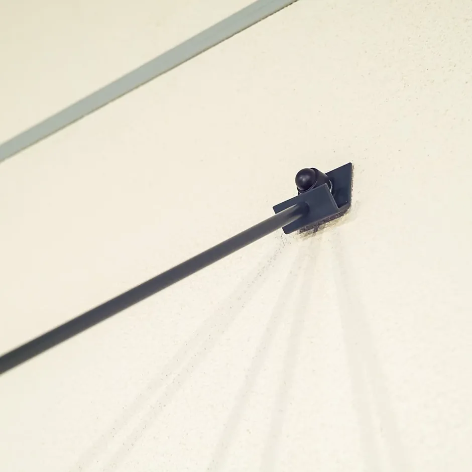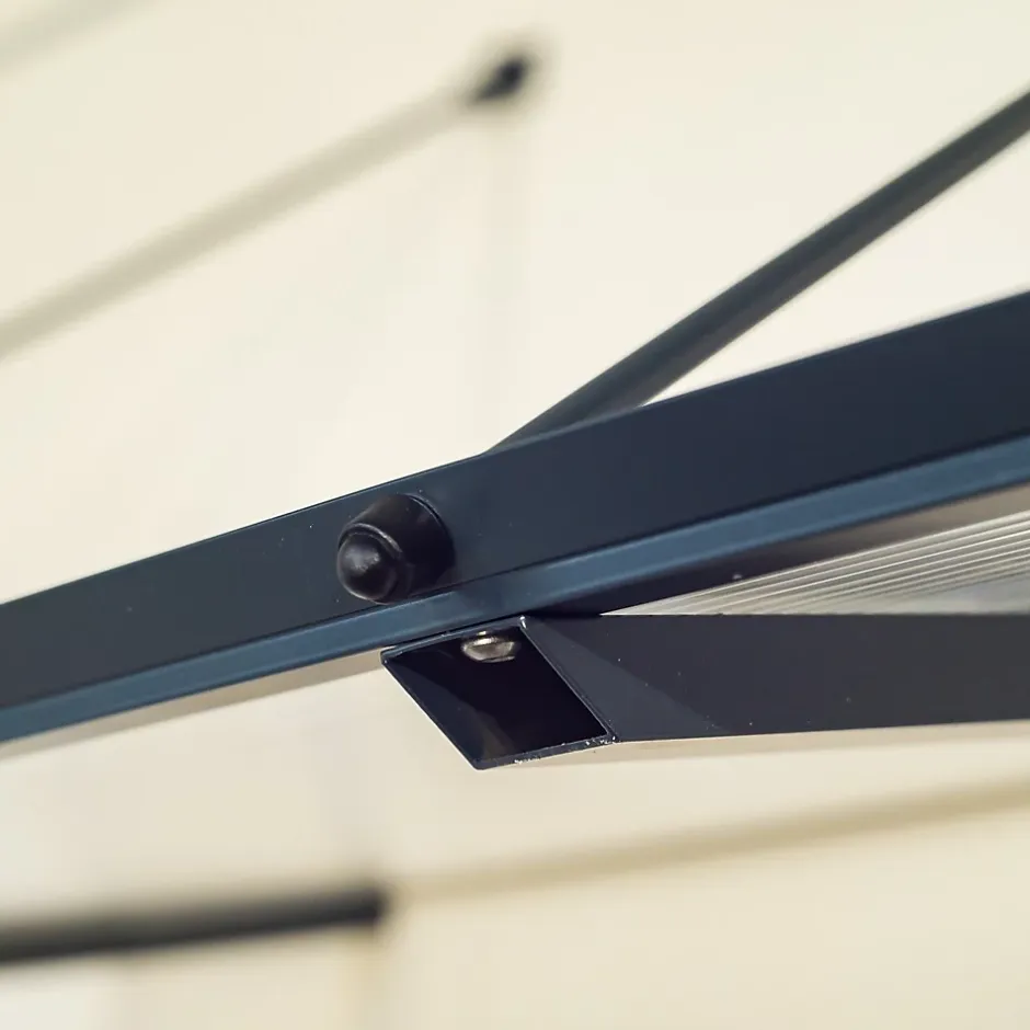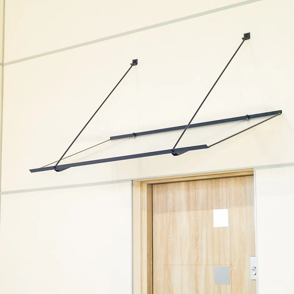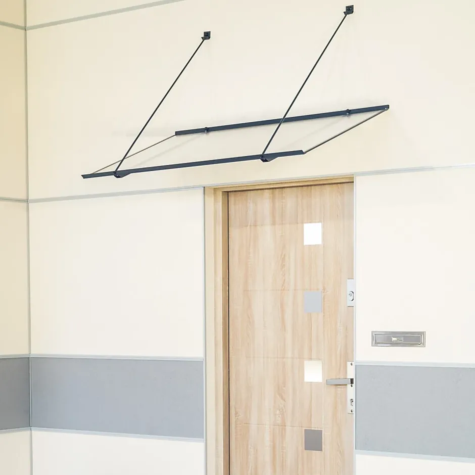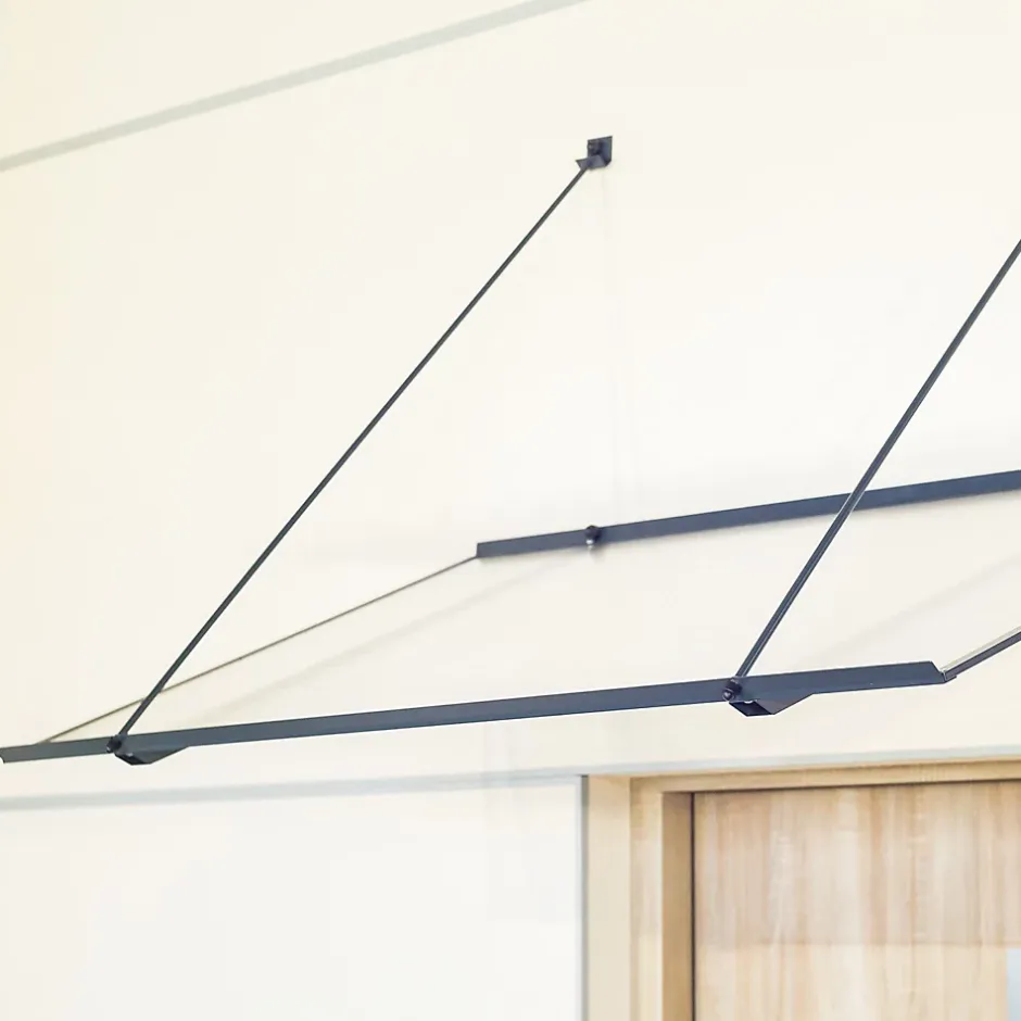 Auvent plat, très léger, doté d’une structure en aluminium thermolaqué et d’un remplissage en plaque alvéolaire en polycarbonate. L’auvent est maintenu par deux tirants fixés sur la partie supérieure de la structure.