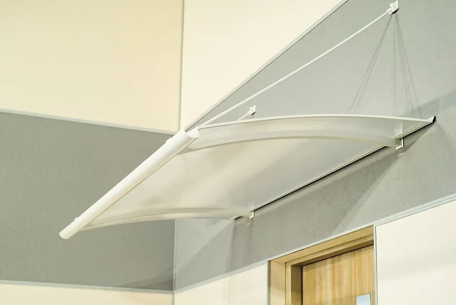 Auvent de type marquise, doté d’une structure en aluminium thermolaqué et d’un remplissage en plaque alvéolaire en polycarbonate. L’auvent est maintenu par deux tirants fixés sur la partie supérieure de la structure.