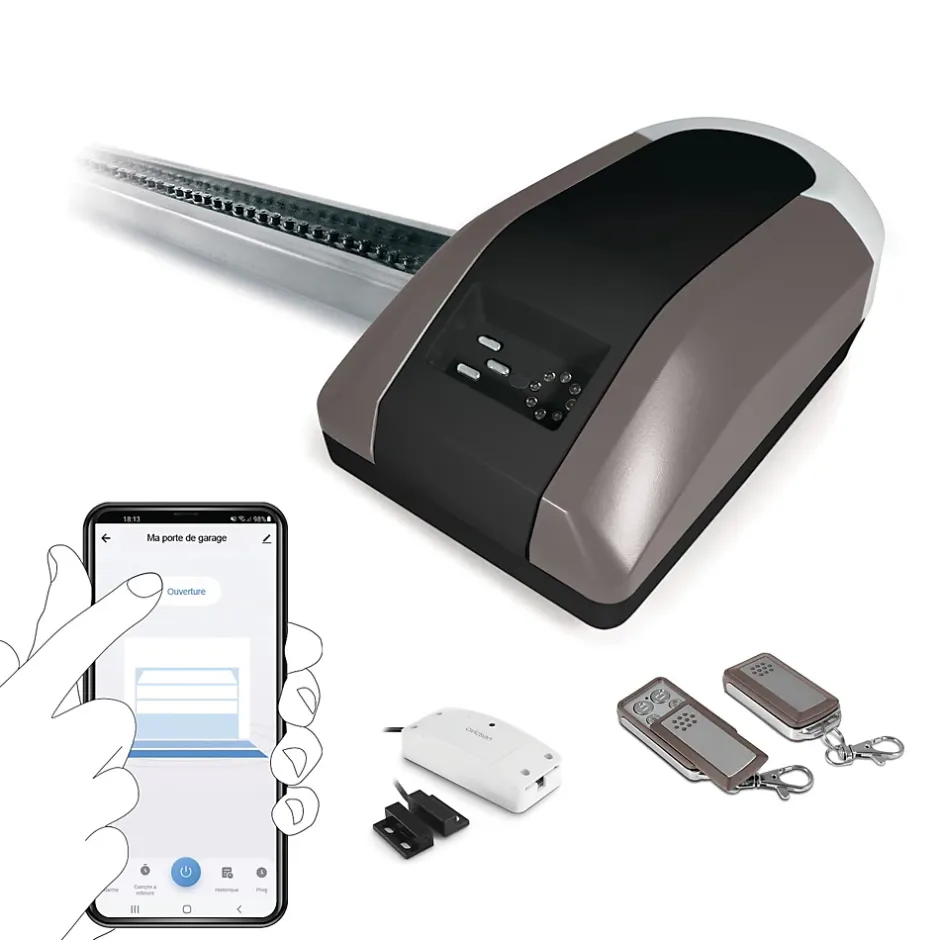 Un kit complet connectéCe kit est connecté et comprend :1 motorisation de porte de garage (ref 114957)1 bloc moteur 200-240 VAC avec son éclairage de courtoisie intégré2 télécommandes à quatre boutons chacuneFixation complète avec rail et chaîneNotice de montage1 module Avidsen HomeGate pour le mode connecté (référence 127041) Une motorisation de garage connectée et compatible Google Home et Amazon AlexaLe module Avidsen Home Gate fait partie de l’environnement Avidsen Home qui permet d’automatiser facilement sa maison. Le module permet donc d’ouvrir et fermer votre garage à distance, mais surtout de savoir si vous n’avez pas oublié de fermer votre garage.Motorisation pour porte de garage sectionnelle de moins de 2,1m hautCette motorisation fonctionne avec toutes les portes de garage sectionnelles qui font moins de 2,1 mètres de haut.Si votre porte est plus haute, elle ne s’ouvrira pas complètement.Si votre porte est plus basse, pas de soucisMotorisation pour porte de garage basculante débordante de moins de 2,2m de hautCette motorisation fonctionne avec toutes les portes de garage basculantes débordantes qui font moins de 2,2 mètres de haut.Si votre porte est plus haute, elle ne s’ouvrira pas complètement.Si votre porte est plus basse, pas de soucis2 télécommandes fourniesCe kit est fourni avec 2 télécommandes.Si vous avez déjà un moteur de portail Avidsen, Extel ou Thomson, vous pourrez avoir les 2 motorisations sur la même télécommande.