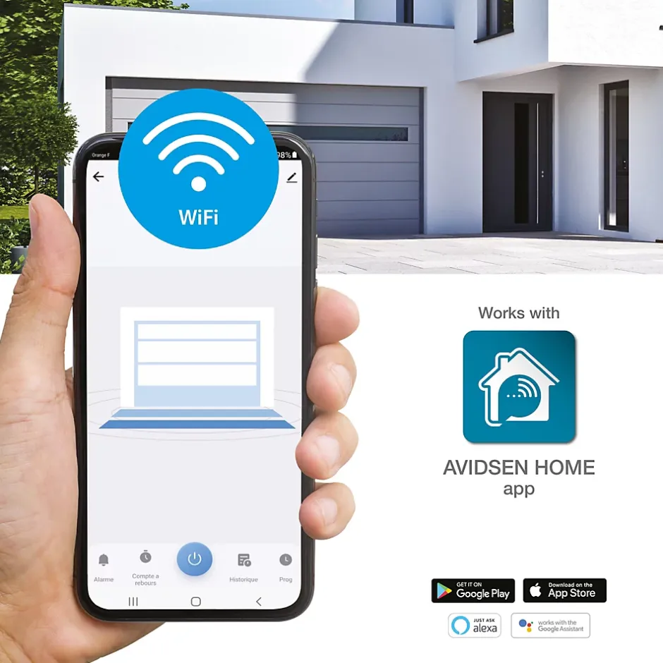 Une motorisation compatible avec de nombreuses configurationsVous pouvez installer cette motorisation de garage pour des portes basculantes débordantes et sectionnelles.Adaptée pour des portes lourdes (jusqu’à 80Kg) et de grandes dimensions (jusqu’à 2,20 mètres) en tous matériaux, le Strömma Connect est la solution pour vous simplifier le quotidien tout en sécurisant votre propriété. Un gain de confort non négligeableQue ce soit avec votre smartphone ou votre télécommande, avoir une porte de garage motorisée connectée vous permet un gain de temps et d’énergie au quotidien : plus besoin de sortir de votre voiture pour pouvoir vous garer dans votre garage !Les avantages d’une motorisation connectéeOuvrez et fermez votre porte de garage via l’application Avidsen Home et les assistants vocaux Google Home et Alexa.L’application Avidsen Home vous permet de savoir si votre porte de garage est ouverte ou fermée lorsque vous vous absentez de votre domicile, un soulagement lorsqu’on a un doute une fois parti !Une ouverture sécuriséeLe moteur effectue un ralenti en fin de course afin de préserver votre installation des chocs éventuels. Lorsque la porte détecte un obstacle à la fermeture, celle-ci se réouvre afin de ne pas l’endommager.Profitez de la lumière LED intégrée au moteur pour rentrer dans votre garage en toute sérénité.Le contenu du kitCe kit contient :1 bloc moteur 200-240Vac 50Hz avec éclairage de courtoisie intégré2 télécommandes 433,92MHz à 4 boutons1 fixation complète avec rail et chaîne1 module de commande wifiNe faites plus d’efforts pour sortir de votre garage, adoptez la motorisati