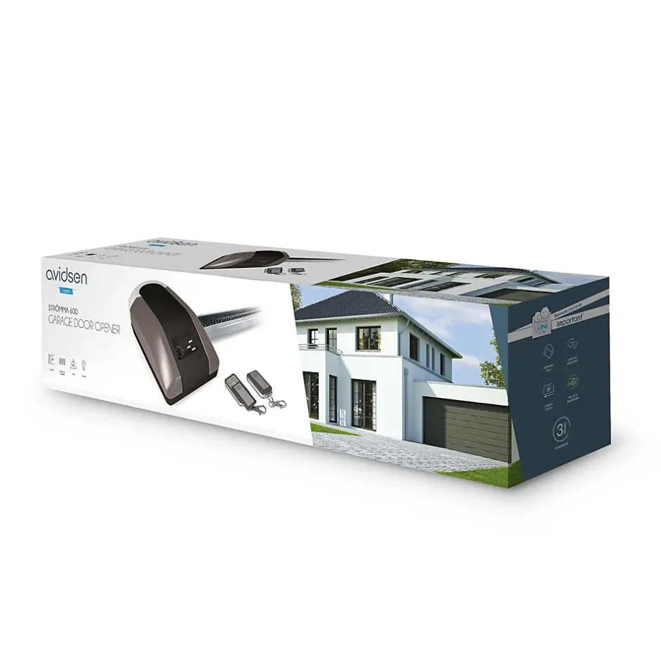 Motorisation de garage Strömma 600 AVIDSEN 230 V, entraînement par chaîne sur rail en U en aluminium, 120 W, conçue pour portes jusqu’à 75 kg (6 m²), vie moyenne ~40 000 cycles, débrayage manuel, réglage électronique des fins de course, détection d’obstacle en fermeture avec réouverture automatique, lampe de courtoisie 24 V, faible bruit (<60 dB) et télécommandes incluses.