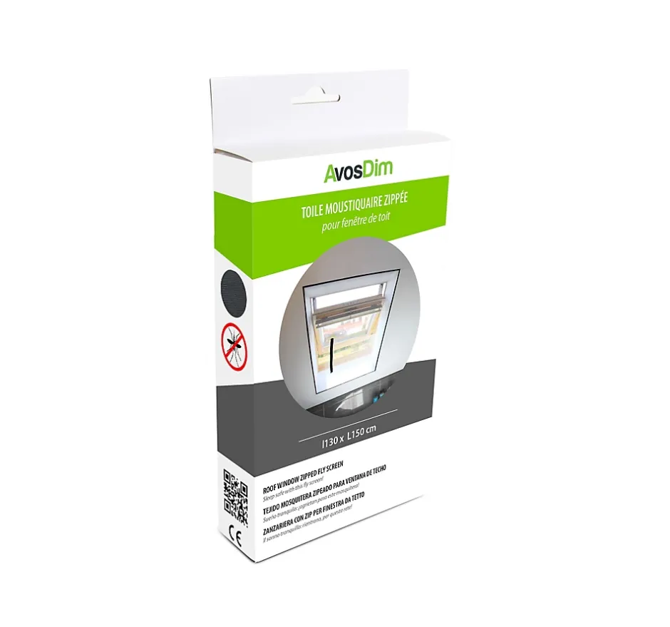 Caractéristiques de la toile Moustiquaire zippée : Usage Moustiquaire : Fenêtre de toit Compatibilité universelle : Fenêtre VELUX , ROTO, FAKRO, TOICIEL … Matériau : Polyester Couleur : Noire Dimension toile : Largeur : 130 cmLongueur : 150 cm Toile souple : Oui Fixation : Bande auto agrippante / adhésive fournie Clarté : Préservée Maillage : Tous les millimètres Entretien : Eponge humide sur la toile pour nettoyer les pollens Adhérence de l’adhésif sur fenêtre Placo : Oui Adhérence de l’adhésif sur fenêtre Bois : Oui Adhérence de l’adhésif sur fenêtre Aluminium : Oui Adhérence de l’adhésif sur fenêtre PVC : Non Résistance griffes de chat : Non Amovible : Non Ce tulle anti moustiques, guêpes, mouches .. vous protège efficacement lors des aérations. Posé sur le bâti extérieur de la fenêtre, il peut rester en place puisqu’il n’entrave pas la fermeture de l’ouvrant. Nous déconseillons sa pose sur support PVC, l’adhérence à long terme n’étant pas garantie. L’ouverture zippée sur le Filet Moustiquaire vous permet d’ouvrir et fermer la fenêtre sans encombre. De manoeuvrer le store également.Les stores pour fenêtres de toit dans notre catalogue sont fabriqués sous la marque AvosDim . Notez que VELUX , citée en tant que marque de fenêtres compatibles, est une marque déposée détenue par VKR Holding A/S.