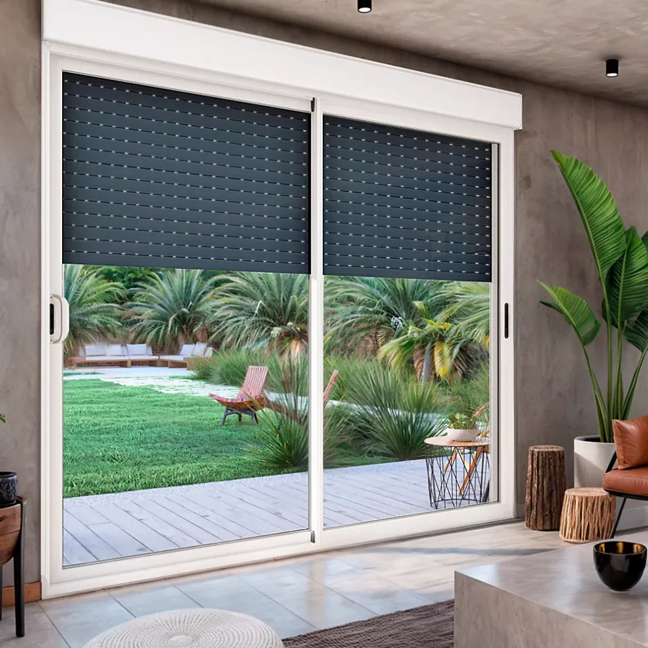 Baie coulissante en aluminium bicolore avec volet roulant électrique intégré motorisation SOMFY l.240 x H.200 cm Uw=2