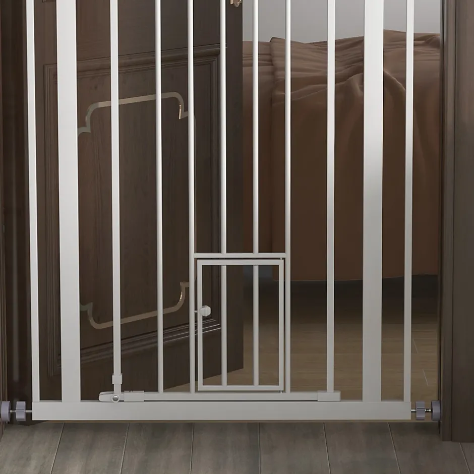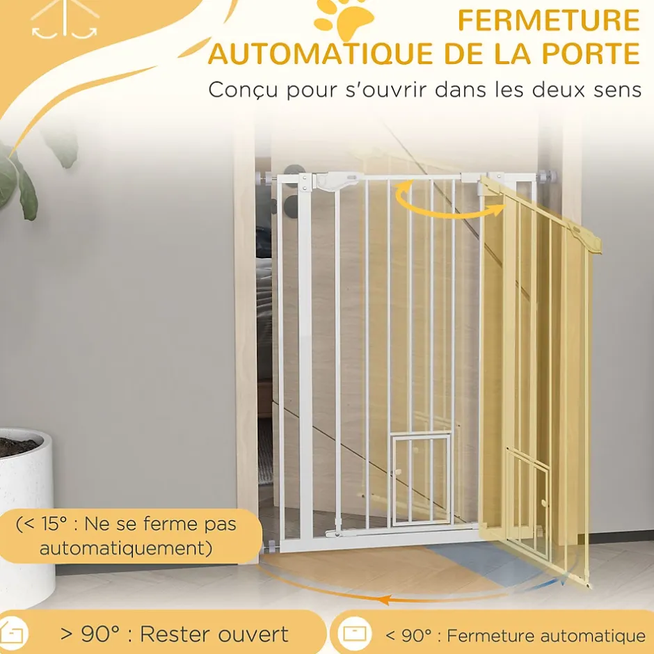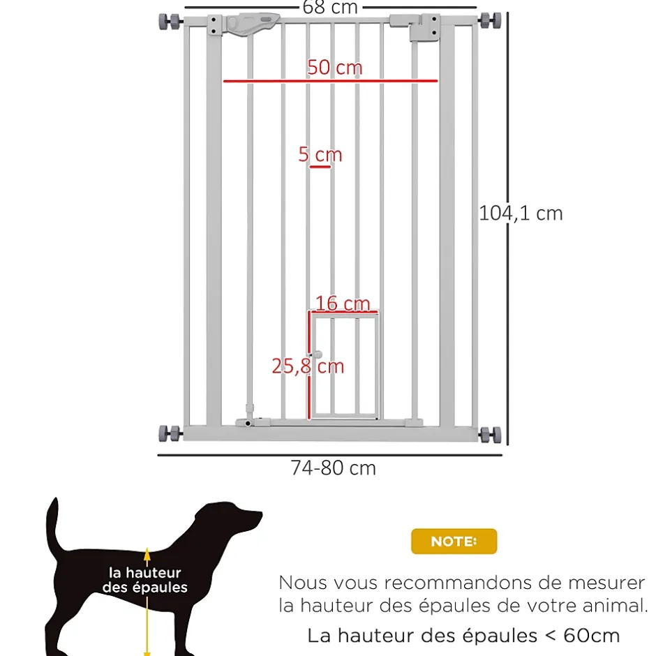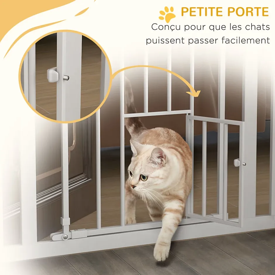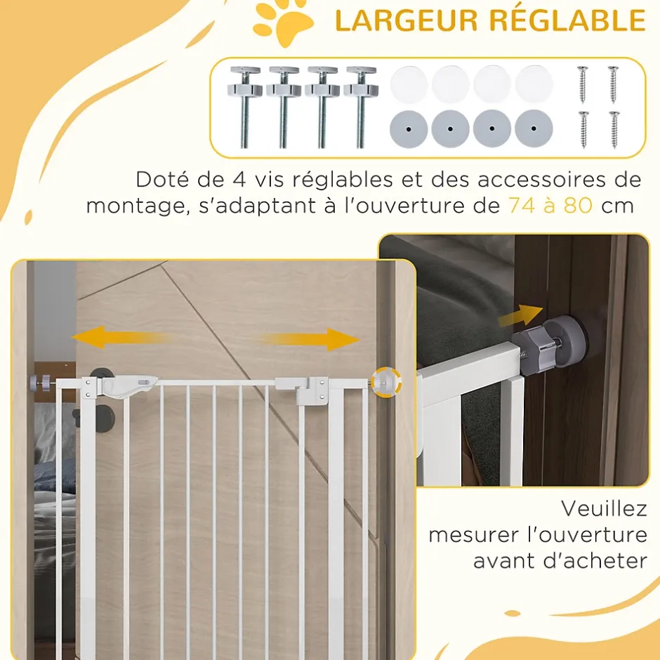 Cette barrière de protection est idéale pour portes et escalier d’une largeur comprise entre 74 et 80 cm. Elle vous permettra d’offrir un maximum de sécurité pour votre animal. Cette barrière de protection en acier se fixe par simple pression entre les cloisons ou encadrement de porte. Aucun perçage ni vissage requis. À noter que cette barrière de sécurité est équipée de 2 portes verrouillables (une grande, une petite) adaptées pour chien et chat.Caractéristiques :- Barrière de protection idéale pour les animaux domestiques, afin de les empêcher d’accéder aux pièces ou espaces de votre maison- Barrière de sécurité équipée de 2 portes verrouillables (une grande, une petite) adaptées pour chien et chat- Fabriquée en acier et plastique robuste, durable- Idéale pour une installation dans les encadrements de porte et en bas des escaliers- Compatible avec des ouvertures d’une largeur comprise entre 74 et 80 cm- Le cadre en U à fixation par pression 4 points permet une fixation ferme- Système d’ouverture à double sens, système de double verrouillage de la grande porte, simple verrouillage de la petite porte : sécurité optimale- Hauteur de 1,04 m idéale pour éviter que votre animal ne passe par dessus- Montage facile et rapide : aucun perçage ni vissage requis- Note : barrière à installer sur les encadrements de la porte ou le mur- Recommandation : bien mesurer votre ouverture avant achatSpécifications :- 2 coloris au choix : noir ou blanc- Matériaux principaux : acier, plastique- Dim. totales : 74-80L x 104H cm- Dim. petite porte : 16L x 25,8H cm- Écartement des barreaux : 5 cm- Livraison effectuée en un colis- Réf. : D06-124/124V00WT