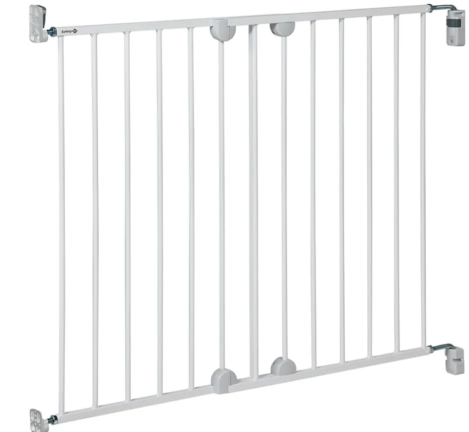 Barrière de porte et d’escalier avec portillon A visser au mur Recommandée en haut des escaliers car absence de barre de sol 2 panneaux coulissent pour couvrir les larges ouvertures De 62 à 102 cm sans extension Ouverture facile d’une seule main Ouverture possible dans les 2 sens Choix du sens d’ouverture (exemple : uniquement vers le palier d’escalier) Retrait facile du mur en l’absence d’enfants Il est recommandé d’installer deux barrières : une en haut et une en bas des escaliers.