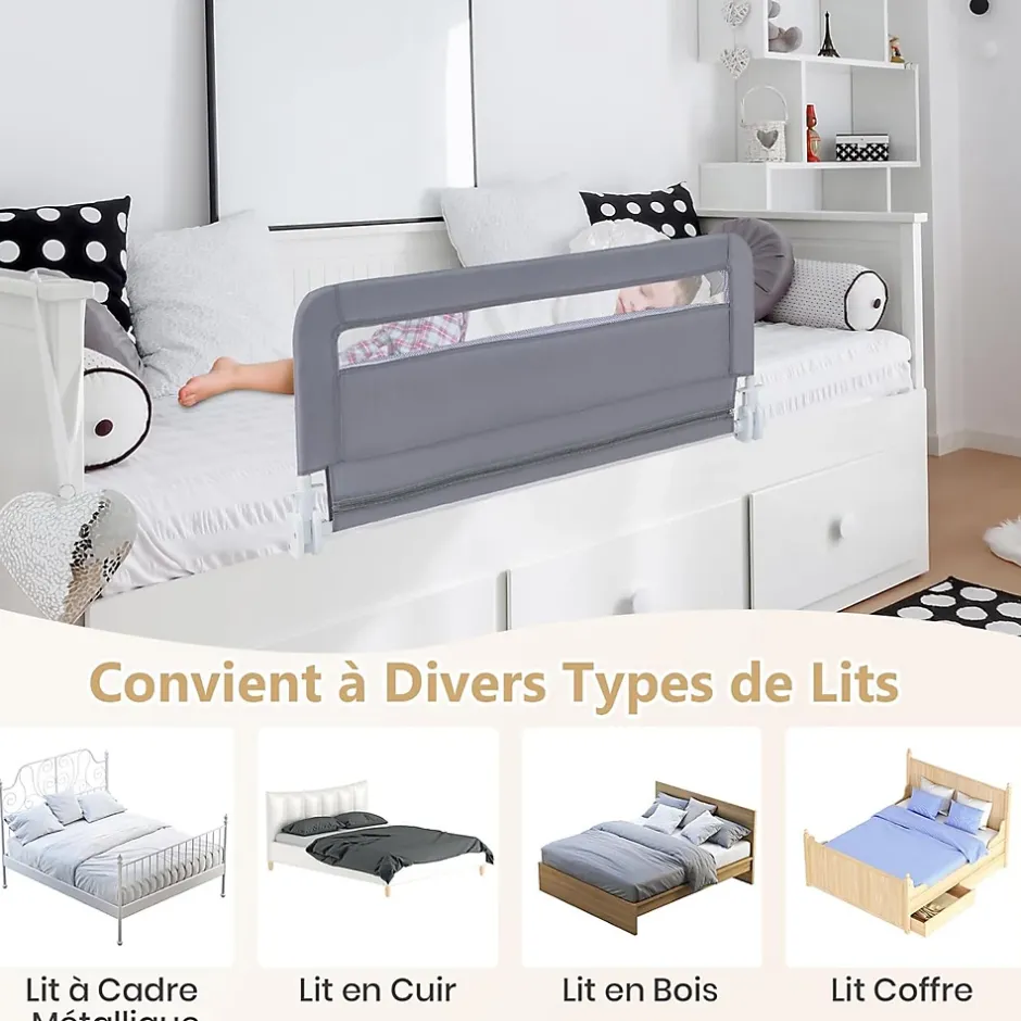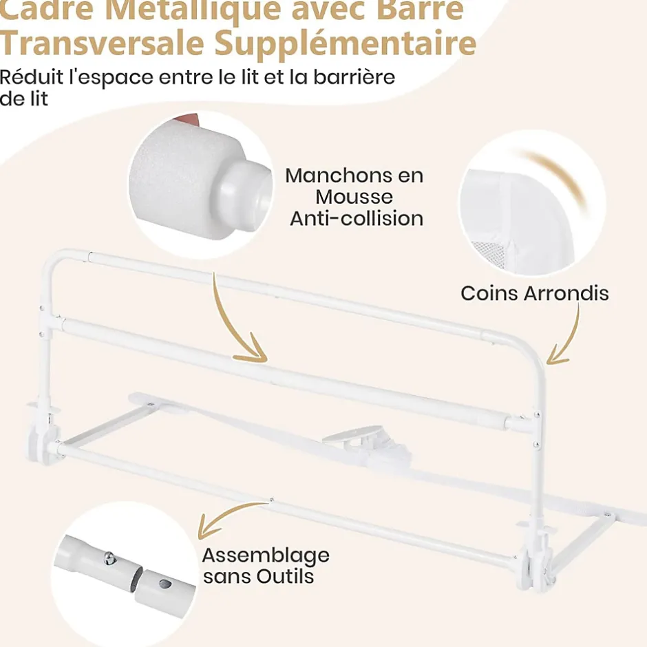 La structure métallique robuste combinée à une barre enveloppée dans une mousse antichoc, assure une stabilité sans tremblements. La maille respirante permet aux parents de vérifier l’état du bébé à tout moment. La barrière rabattable facilite l’accès. La housse dotée d’une fermeture éclair est facile à retirer pour le lavage. Elle est compatible avec plusieurs types de lits, et vous pouvez choisir le nombre d’unités en fonction de la taille du lit.