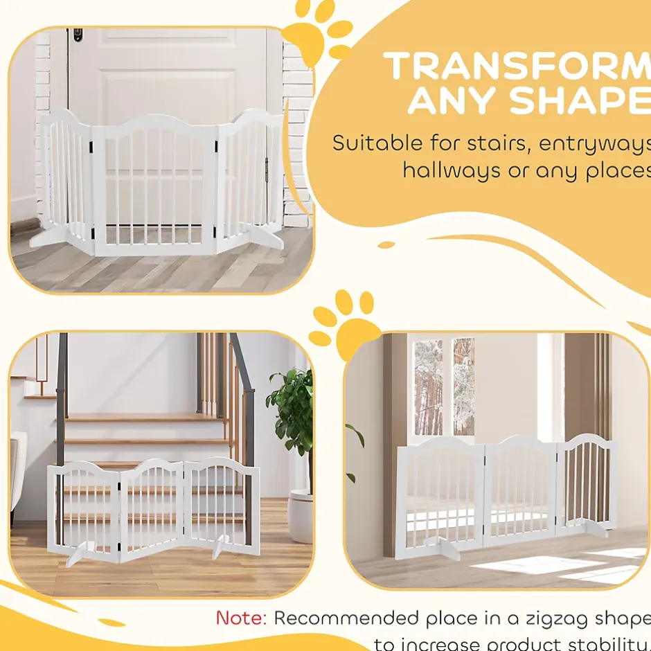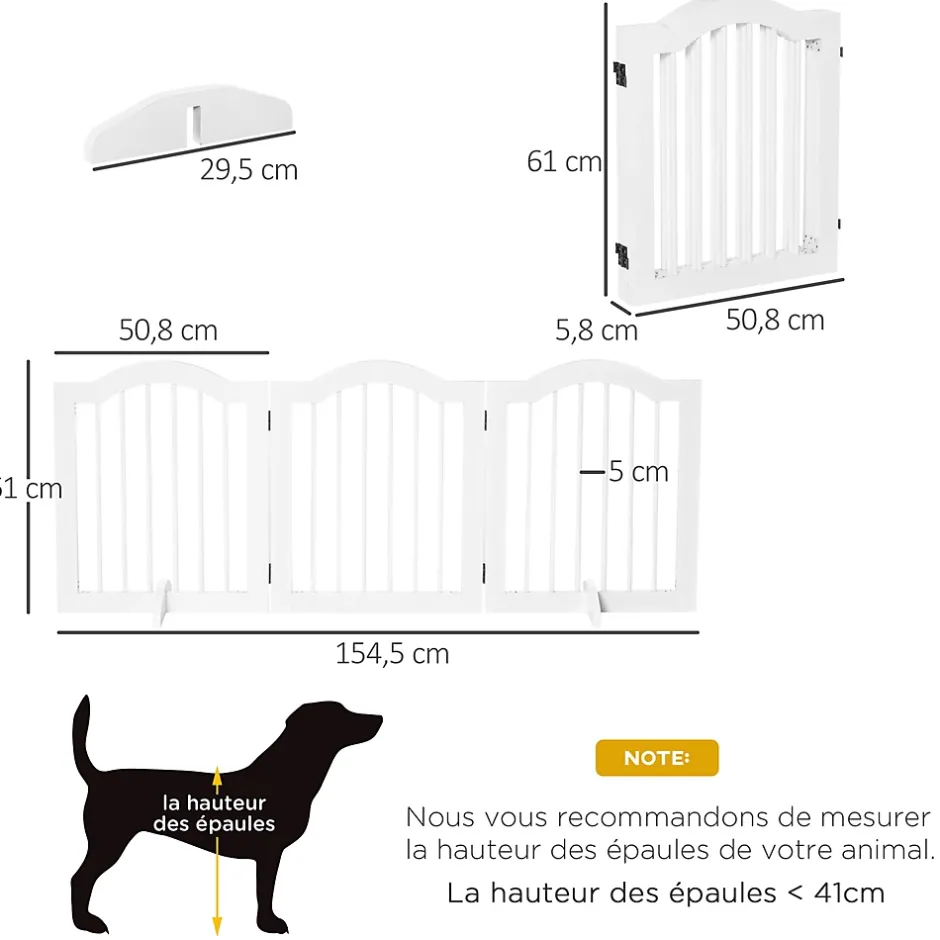 Cette barrière de sécurité pliable vous sera très pratique et vous permettra de retenir votre animal hors d’un accès ou d’une zone. Fabriquée intégralement en MDF, pouvant être étendue jusqu’à 1,54 m, cette barrière vous deviendra vite indispensable. Caractéristiques : – Barrière coloris blanc sobre et moderne en 3 panneaux avec double piètement support amovible inclus- Idéal pour protéger les escaliers, couloirs, chambres, accès avec porte de toute intrusion de votre animal- Permet d’éduquer votre animal quant aux zones autorisées- Modulable très facilement pour s’adapter à différentes tailles de portes ou d’accès- Barrière pliable et portable, rangement compact pratique si inutilisation- Patins antidérapants afin d’optimiser la stabilité de la barrière- Fabrication à partir de matériau résistant (MDF) pour un usage pérenne Spécifications : – Couleur : blanc- Matériau principal : MDF- Dimensions ouvertes : 154,5L x 61H cm- Epaisseur panneau : 1,8 cm- Taille de chaque panneau : 50,8L x 61H cm- Livraison effectuée en un colis- Réf. : D06-048V01WT