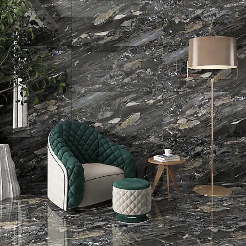 Carrelage ARION – Profondeur sombre et effet marbre spectaculaireLe carrelage ARION se démarque par son effet marbre noir/graphite très graphique, mêlant des nuances d’anthracite, de gris fumé et quelques touches minérales plus claires (beige/ivoire). Sa finition brillante accentue la profondeur du dessin et apporte de beaux reflets, parfaits pour créer une ambiance chic, moderne et haut de gamme.Format : 60 x 120 cm – Épaisseur : 7 mm – 1 carreau = 0,72 m²Idéal pour donner du caractère à un salon, une entrée, une salle de bain ou même un espace professionnel, ARION devient une vraie pièce maîtresse. Il s’associe super bien avec des murs clairs, du bois naturel, du noir mat ou des touches métal (laiton/doré). Sa surface lisse facilite l’entretien au quotidien et garde un rendu élégant dans le temps.