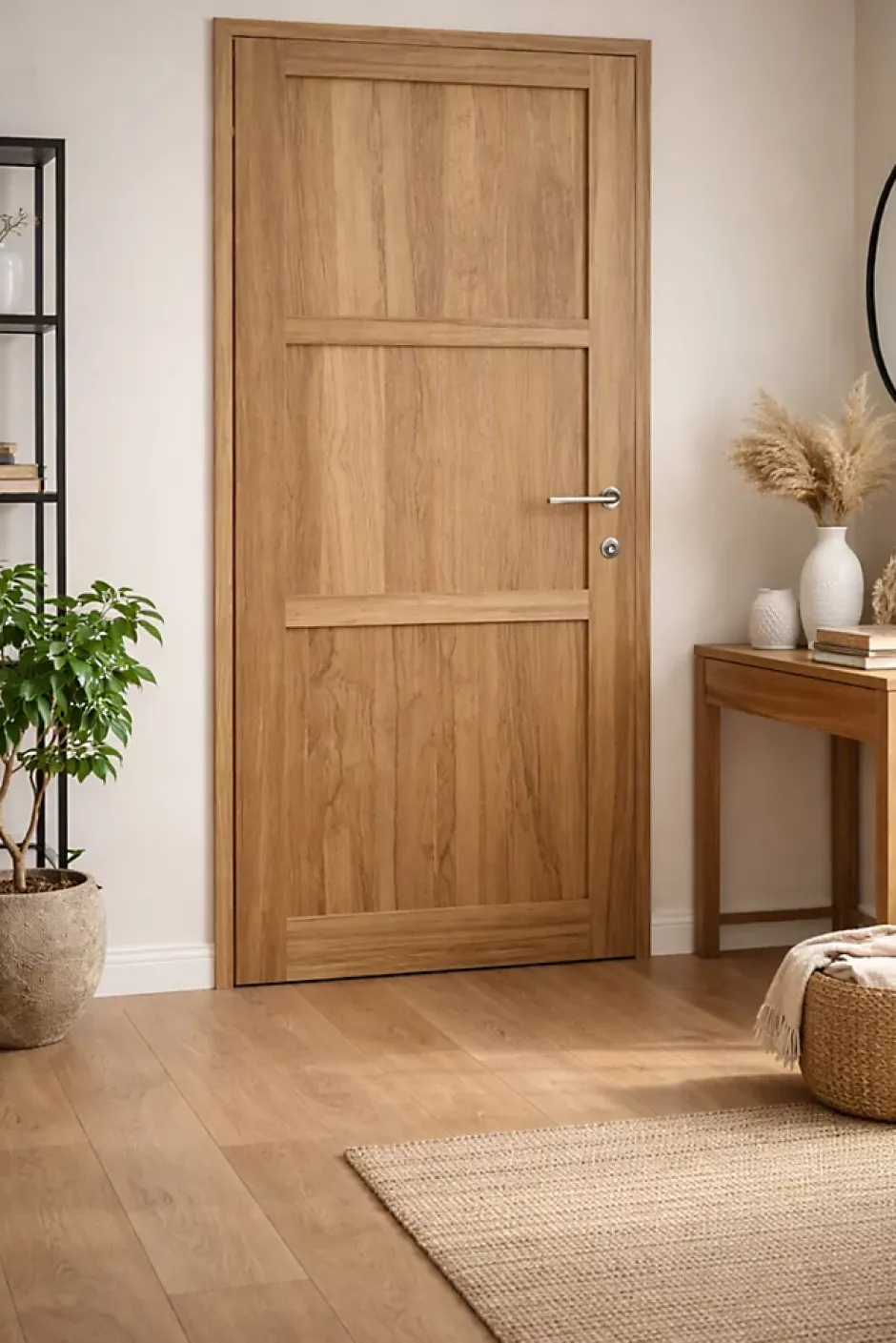 Bloc-porte Frake 3 panneauxCaractere du bois et design contemporainLe bloc-porte Frake 3 panneaux est une solution elegante et chaleureuse pour structurer vos espaces interieurs. Realise en MDF avec placage Frake et fabrique en France, il se distingue par son veinage expressif et son esthetique contemporaine.Avec une dimension cotes tableau de H 204 x L 83 cm et une dimension hors tout de H 210,2 x L 89,5 cm, ce bloc-porte est dote d’un ouvrant de 40 mm d’epaisseur, garantissant robustesse et stabilite. Les panneaux MDF plaques Frake offrent un rendu naturel et une finition soignee.La porte est composee de trois panneaux MDF, creant un design structure et elegant. Elle est montee sur une huisserie de 72 x 45 mm, assurant une installation fiable et durable.Livre pret a poser, le bloc-porte comprend une serrure a cle et une gache posees, ainsi qu’un joint d’isolation isophonique pour un confort acoustique optimal.Sens d’ouverture : poussant gauchePoignee inclusConçu exclusivement pour un usage interieur, ce bloc-porte doit imperativement etre installe dans un espace chauffe et isole, afin de garantir sa durabilite et ses performances.