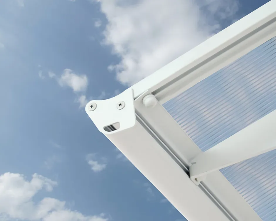 - Une conception qui évacue l’eau sur les côtés pour garder votre entrée et votre porte protégée de la pluie et des rayons UV