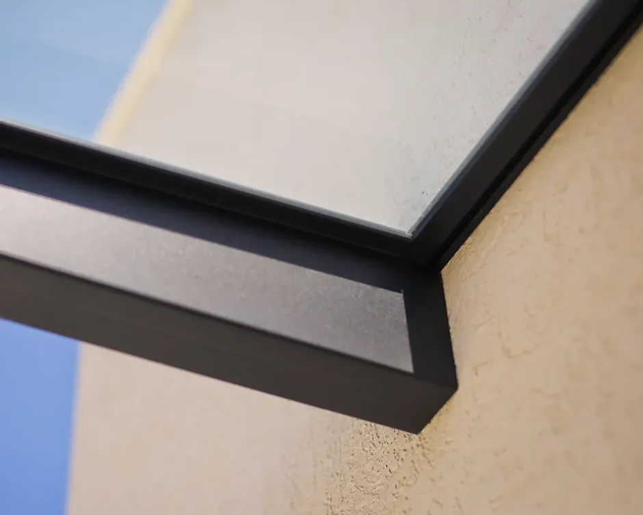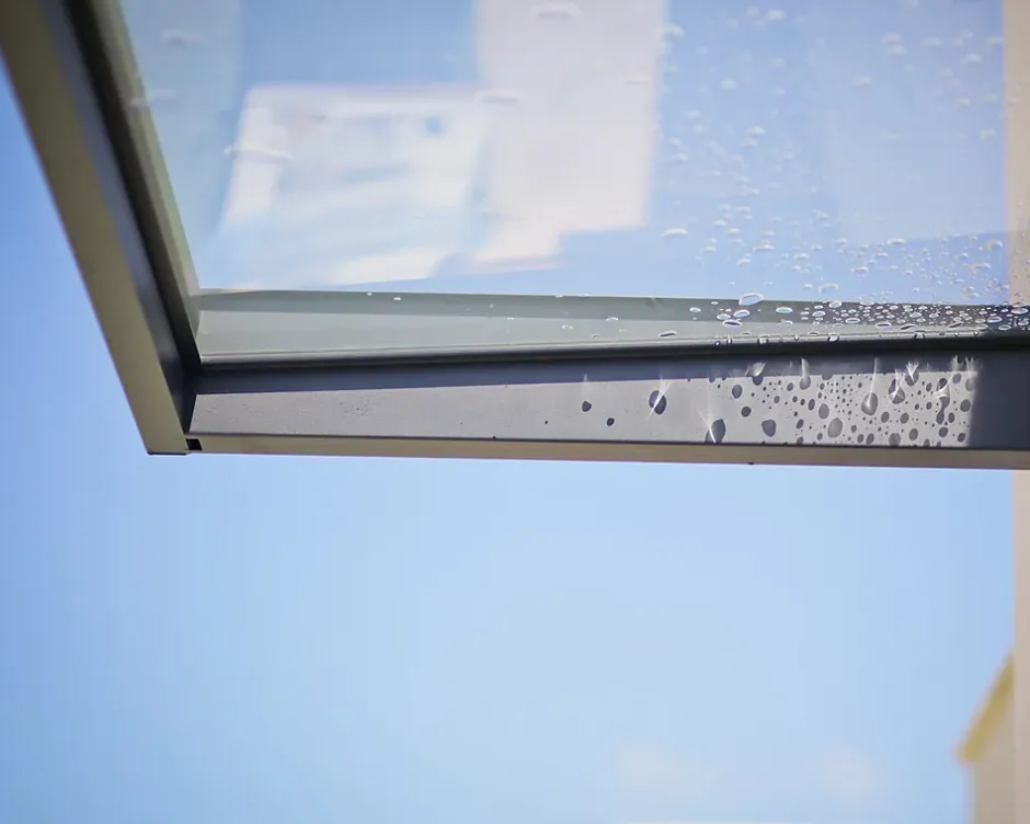 - La gouttière intégrée et dissimulée évacue l’eau de pluie sur le côté.