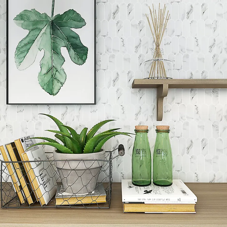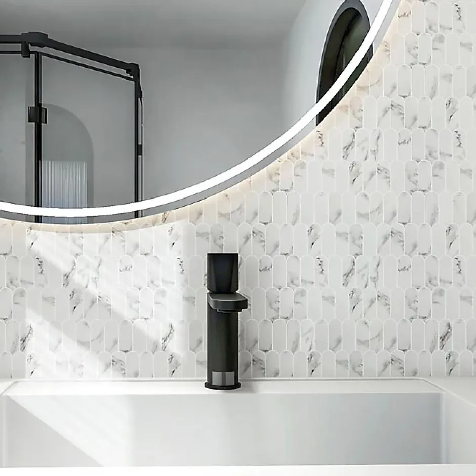 Transformez votre espace avec notre mosaïque écaille longues en verre recyclé blanc. Son effet marbre et sa finition mate ajoutent une touche chic à votre cuisine ou salle de bain.
