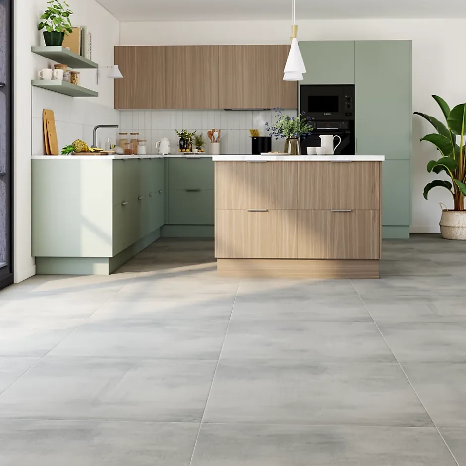 - Le carrelage Abstract silver offre une esthétique moderne avec son effet béton et sa couleur grise, s’adaptant à divers styles d’intérieur.