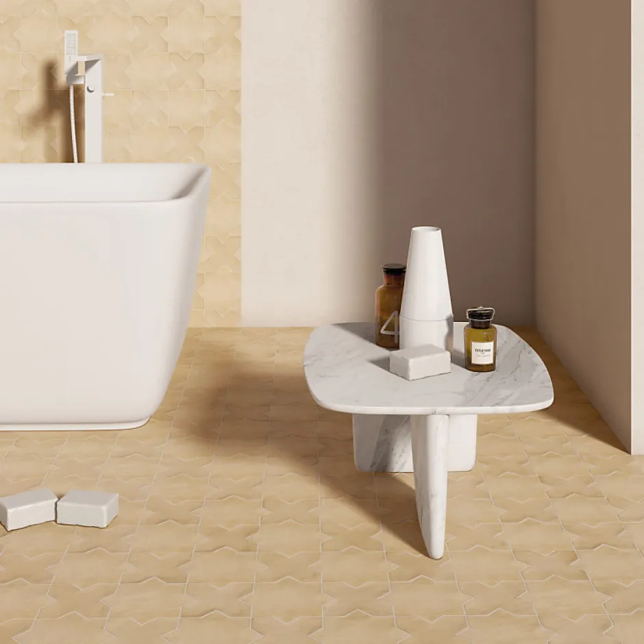 Matière: Grès cérame Dimensions: 16,8 x 16,8 cm Usage: Intérieur Destination: Sol & Mur Finition: Mate R9-B classe 1 Rectifié: Non Epaisseur: 8,8 mm Nuance : V1 variation minime Existe en: 5 coloris . * A fin de calculer le bon nombre de cabochons nécessaires à votre usage, n ous vous conseillons de suivre l’un des 3 schémas de pose en photo. . . . La série Kasbah tout droit inspiré des faïences marocaines fera voyager votre intérieur à travers une palette de formes et de couleurs que vous pourrez personnaliser et composer selon votre imagination. . Ces série à cabochons à la finition mate rappellent le style arabesque. Elles pourront être associées aux cabochons ou au carreau Star de la même série pour créer un effet mosaïque répétitif si caractéristique de cette architecture. Vous disposerez d’un large choix de couleurs traditionnelles au travers de tons de terre chauds tels que l?ocre, la terre cuite et le sable, ainsi que dans des couleurs neutres telles que le gris. On retrouve également des tons bleu, outremer, vert émeraude, rose ou blanc dans les tacos finition brillante et mate. . Vous aurez également la possibilité de créer un assemblage de carreaux ton sur ton pour créer un style plus épuré et contemporain. N’hésitez pas à nous contacter pour demander un échantillon. .