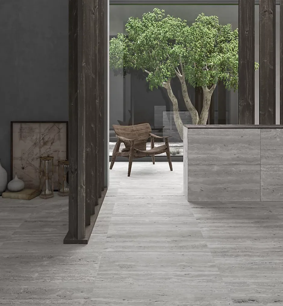 Notre collection de carreaux de sol extérieur effet travertin qui s’intègre parfaitement à tout espace extérieur ou intérieur.