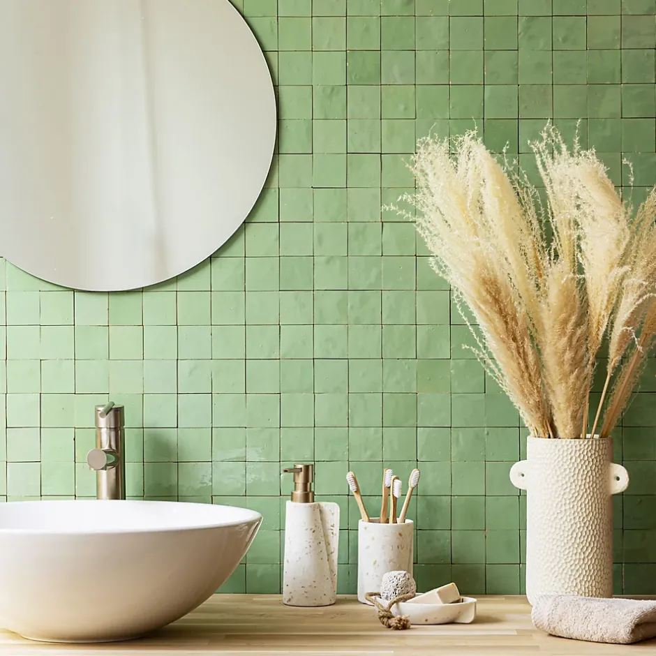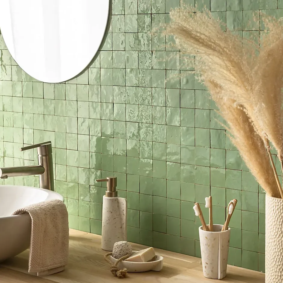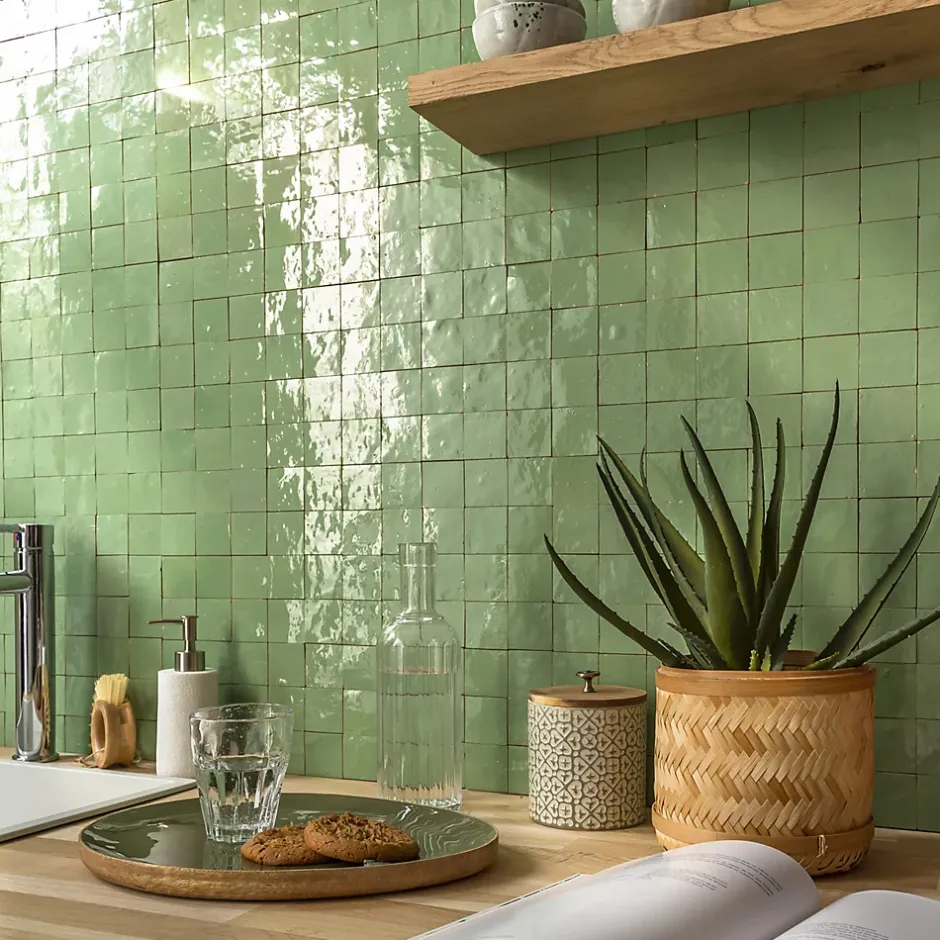Découvrez notre Carrelage Zellige Marocain Vert Amande 5×5 cm (vendu par plaque de 30×30 cm soit 0,09 m²) – INFORMATIONS -> Ce produit est en Terre cuite. Comme tous les matériaux naturels, des variations sont possibles entre les produits présentés et ceux livrés ainsi qu’entre les produits livrés eux-mêmes. De manière non limitative, ces variations peuvent porter sur la couleur, le veinage, l’aspect, la dimension, l’épaisseur, et autres défauts purement esthétiques qui n’altèrent en rien les caractéristiques techniques des produits.> Ce produit est destiné exclusivement à un usage mural. Tout usage en plan de travail, en table ou en surface en contact avec des aliments est interdite.> Nos photos sont réalisées par des professionnels avec l’objectif de représenter les produits de la façon la plus fidèle possible. Cependant, en fonction de votre écran et des paramètres appliqués, l’aspect et les couleurs du produit sur votre écran peuvent légèrement différer du produit original.