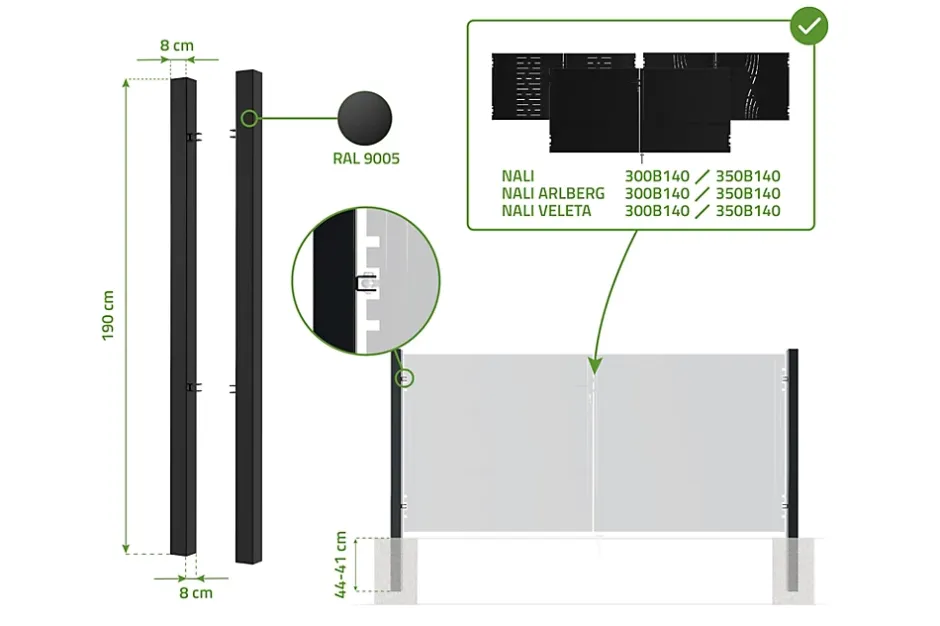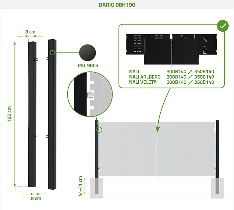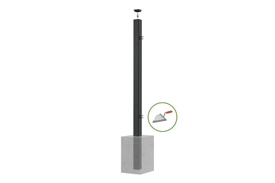 Lot de 2 poteaux en fer – Noir MatHauteur : 190cm & Section: 8x8cm Poteaux très résistants en acier galvanisé A sceller ou visser sur platineCasanoov est spécialisé dans les portails et portillons en KIT, à assembler et à poser soi-mêmeLes poteaux en acier DARIO ont été conçus pour permettre la pose des portails et portillons modèles NALI.Traités anti-corrosion, ce lot de deux poteaux en acier galvanisé s’avère très résistant, quelles que soient les conditions climatiques.Ce pack composé de deux poteaux DARIO de diamètre 80mm et de hauteur 190cm est parfaitement adapté aux portails CASANOOV suivants : – NALI 300B140 NOIR- NALI ART ARLBERG 300B140 NOIR- NALI ART VELETA 300B140 NOIRColoris : Noir mat (RAL : 9005)Matériau : Acier galvaniséHauteur du poteau : 190 cmSection du poteau : Ø80 mmMode de pose : à sceller ou visser sur platineHauteur maximum du portail à installer : 140 cm (Modèle NALI)Conseils :Afin de permettre le scellement de nos portails et portillons en acier, les poteaux ont été conçus 50 cm plus longs que la hauteur du portail ou portillon correspondant.Pour une installation sécurisée et solide, il est recommandé de sceller vos poteaux entre 44 et 46 cm de profondeur.Si vous ne désirez pas les sceller, il est tout à fait possible de les poser sur des platines pour portillon.Dans ce cas, nous vous conseillons de scier les poteaux pour des raisons esthétiques.Conçus en coloris noir mat (RAL : 9005), ils seront parfaitement assortis à votre portail et/ou portillon NALI pour un extérieur uniforme et surtout élégant.