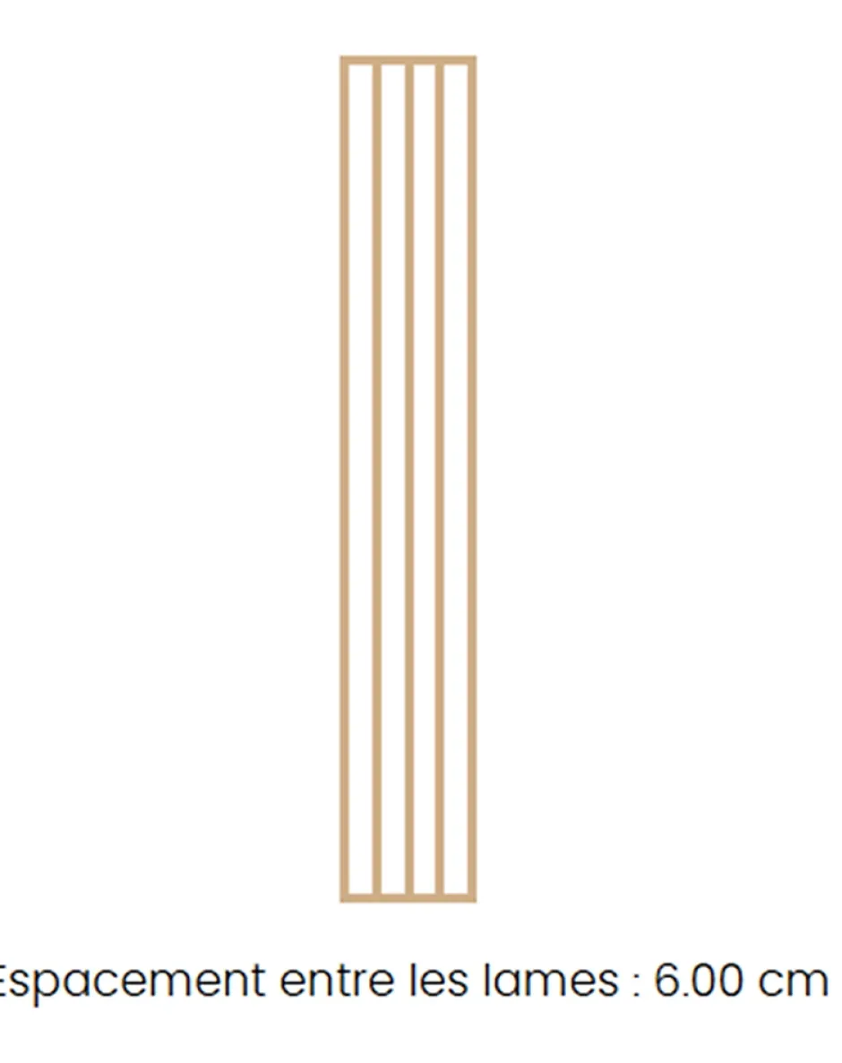 Cloison bois, claustra chêne – 5 lames – H.254 cm × L.40 cm × P.7 cm Donnez du relief à votre aménagement intérieur avec cette cloison claustra en chêne massif de 40 cm de large. Le kit comprend 5 lames verticales de 247,6 cm et 2 lames horizontales de 40 cm, à assembler avec 20 vis fournies (4 par lame verticale). Les lames sont non percées, vous laissant la liberté d’adapter la pose à votre projet. Hauteur : 254 cm Largeur : 40 cm Profondeur : 7 cm Lames verticales : 5 × 247,6 cm Lames horizontales : 2 × 40 cm Fixation par vis – 20 vis incluses Installation simple et rapide, avec 2 piges de positionnement fournies Fabrication française La photo est une illustration visuelle du produit. Veuillez vous référer à l’image d’illustration pour une idée du rendu du bois. Fabriqué par AD LYON GROUPE dans notre usine située dans l’Ain, près de Lyon.